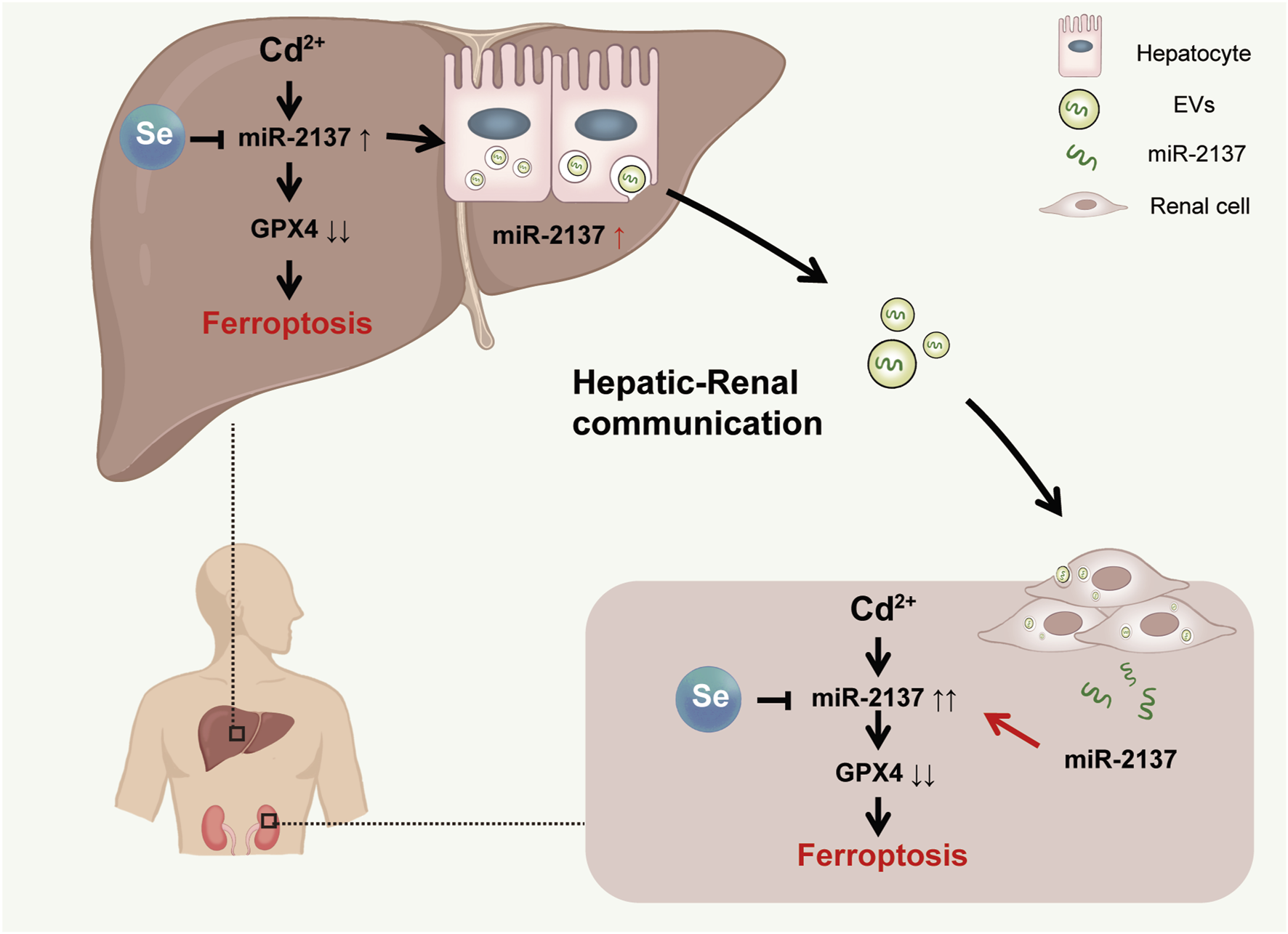 Cd exposure has been demonstrated to induce tissue damage by decreasing the levels of GPX4 in mouse liver and kidney, thereby leading to ferroptosis. Concurrently, under conditions of Cd exposure, the liver targeted the renal GPX4 by secreting exosomes containing miR-2137, which in turn increased renal ferroptosis levels. The administration of Se was observed to mitigate the organ toxicity of Cd exposure to the liver and kidney, as evidenced by an increase in GPX4 levels.