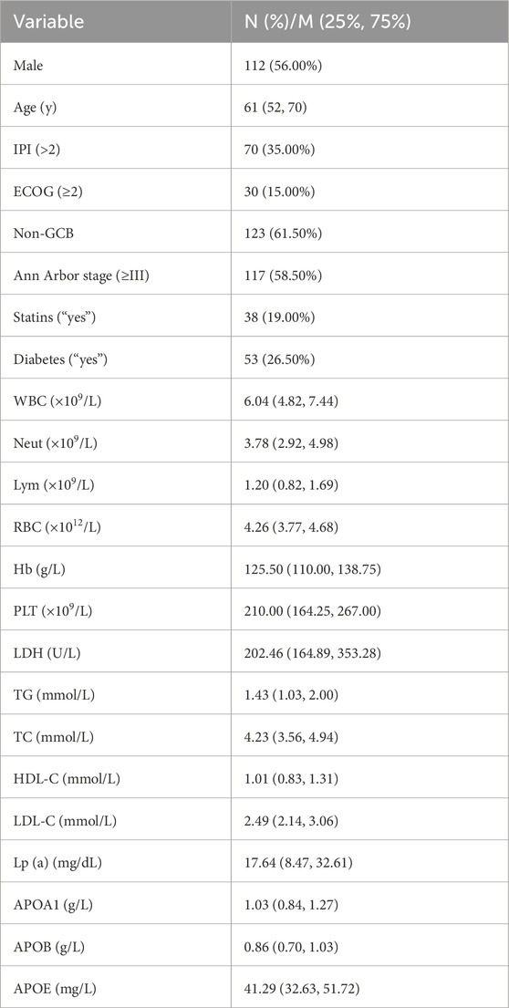 According to the diagnostic criteria established by the World Health Organization (WHO), 200 patients diagnosed with DLBCL at the Second Affiliated Hospital of Nanchang University between October 2010 and December 2023 (112 males and 88 females; median age, 61 years) were included in the DLBCL group for retrospective analysis. Additionally, 185 age- and gender-matched healthy individuals were recruited from the health examination center of the same hospital to serve as the control group. The demographic characteristics of the patients are provided in Table 1. All data in this study were obtained in compliance with the ethical principles of the Declaration of Helsinki and approved by the Institutional Ethics Committee of the Second Affiliated Hospital of Nanchang University, Jiangxi, China.