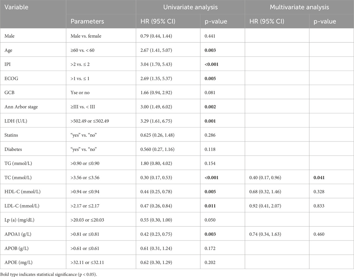 To identify potential prognostic factors, univariate and multivariate Cox regression analyses were performed for OS (Table 2). Univariate analysis revealed that age, IPI score, ECOG score, Ann Arbor stage, lactate dehydrogenase (LDH), TC, HDL-C, LDL-C, and ApoA1 were significantly associated with OS (p < 0.05). In the multivariate analysis, after excluding known prognostic factors (such as age, IPI score, ECOG score, Ann Arbor stage, and LDH), serum lipid index that were associated with OS in the univariate analysis were incorporated into the Cox proportional hazards regression model. The results demonstrated that TC was an independent prognostic factor for DLBCL (p < 0.05).