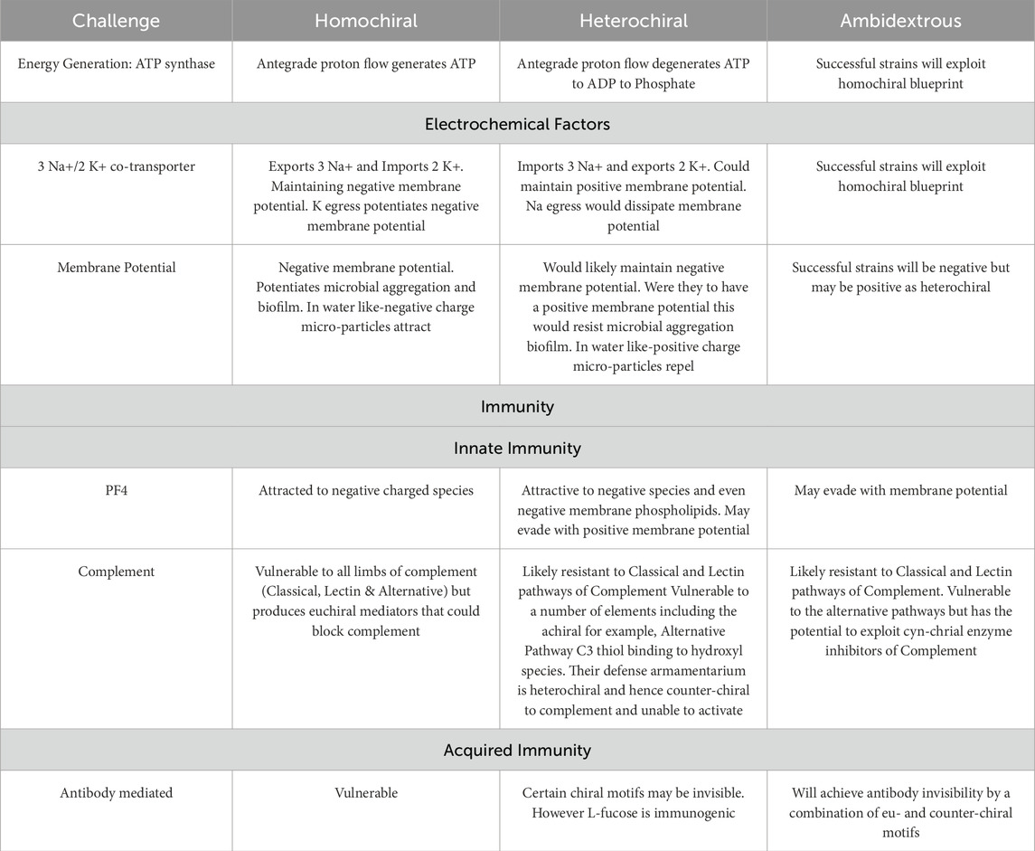 Chiro-discordant microbes are potentially energetically non-viable. One need only look for examples in the most fundamental and empiric processes, such as those related to energy transductions. ATP synthase is contingent upon a rotatory mechanism whereby the transit of three protons generates one molecule of ATP by sequential 120o third-rotations. This is a chiral process with a chiral enzyme and organism. If the chirality of ATP synthase is reversed, standard proton migration would result in the degradation of ATP to ADP and phosphate (Nesci et al., 2015) and would be deleterious to the hetero-enantiomeric pathogen. An efflux of protons would be required for ATP generation which would potentially require a mirror microbe to reverse its membrane potential, such that it be positive in polarity. While this may not be insuperable, it is exceedingly challenging. The negative membrane potential is preserved by a number of factors, the majority, if not all, of which are non-chiral and dependent upon the fundamental nature of the most abundant and diminutive ions (Benarroch and Asally, 2020). The first is the selective permeability of the membranes to ions. This is a function of the fundamental physical properties of the most prevalent and bioactive ions on earth such as sodium, chloride, potassium, and calcium, all which are achiral. The second is the presence of ion transporters and channels. These, unlike ATPases, lack a chiral-contingent rotatory mechanism; hence any chirality they do exhibit does not necessarily affect the direction of movement of achiral metallic ions. Finally, any asymmetry in the electrical charges of membrane lipids on either side of the membrane (Ohki phenomenon) may play a role (Hughes, 2024), which is again unrelated to chirality. Even if the polarity of the ATPase was reversed, this would merely result in heterochiral ATP being created and released outside of the anti-enantiomeric pathogen. Simply put, membrane potential is not dependent upon chirality, but ATP generation is. This mismatch poses an existential conundrum for mirror lifeforms in how to choreograph proton migration down an achiral electrochemical gradient with chiral ATP synthesis.