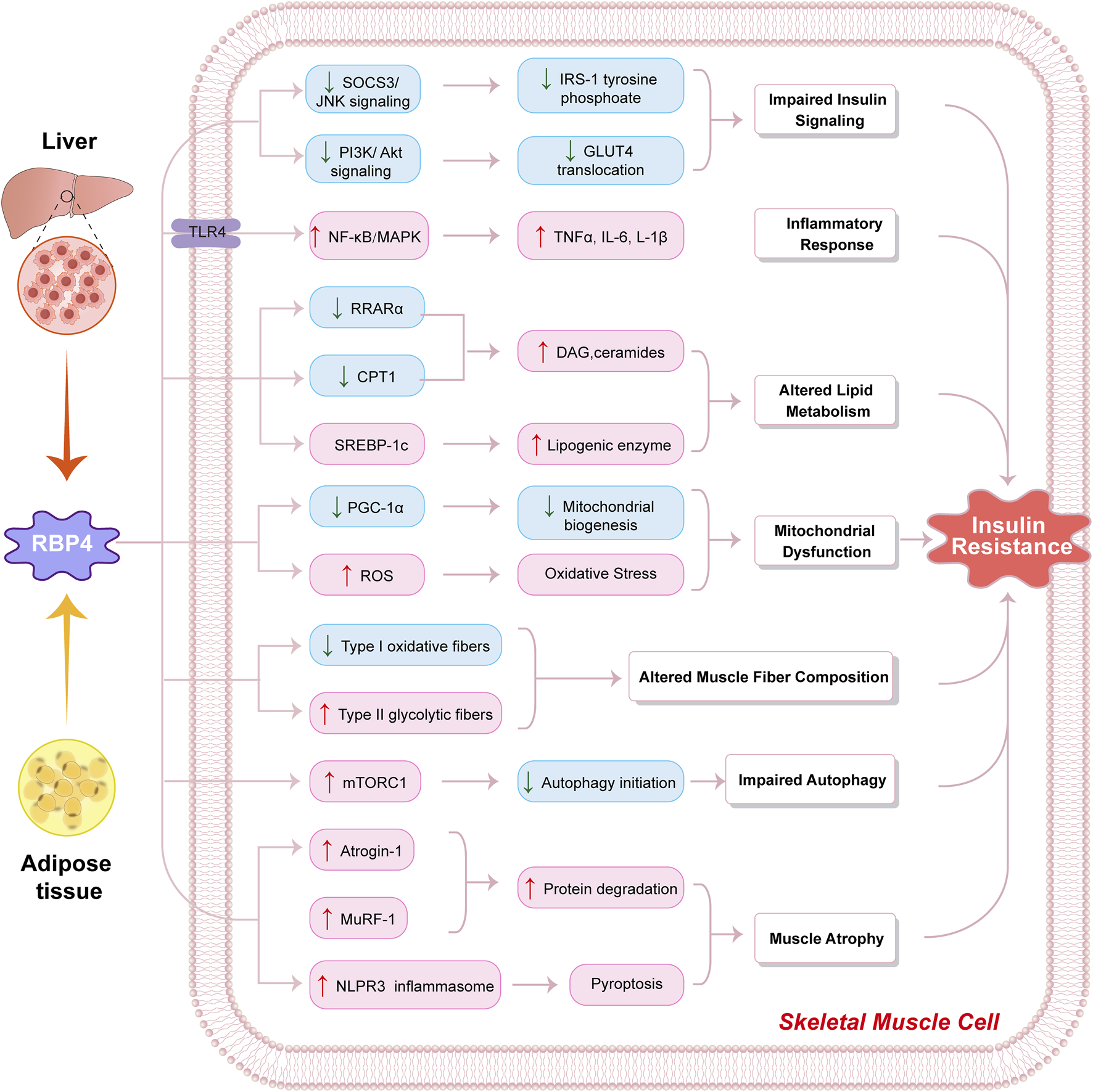 Molecular mechanisms by which RBP4 influences skeletal muscle metabolism. Schematic illustration of how retinol-binding protein 4 (RBP4) derived from liver and adipose tissue induces insulin resistance in skeletal muscle cells through multiple pathways. RBP4 triggers: (1) Impaired insulin signaling via decreased SOCS3/JNK and PI3K/Akt signaling, leading to reduced IRS-1 tyrosine phosphorylation and GLUT4 translocation; (2) Inflammatory response through TLR4-mediated activation of NF-κB/MAPK pathway, resulting in increased production of inflammatory cytokines (TNFα, IL-6, L-1β); (3) Altered lipid metabolism through downregulation of RRARα and CPT1, and activation of SREBP-1c, leading to increased DAG/ceramides and lipogenic enzyme levels; (4) Mitochondrial dysfunction via decreased PGC-1α-mediated mitochondrial biogenesis and increased ROS production causing oxidative stress; (5) Altered muscle fiber composition showing decreased Type I oxidative fibers and increased Type II glycolytic fibers; (6) Impaired autophagy through mTORC1 activation and reduced autophagy initiation; and (7) Muscle atrophy via upregulation of Atrogin-1, MuRF-1, and NLPR3 inflammasome activation leading to increased protein degradation and pyroptosis. These molecular alterations collectively contribute to the development of insulin resistance in skeletal muscle cells. Blue boxes indicate decreased expression/activity; pink boxes indicate increased expression/activity. Arrows indicate activation/induction; lines indicate inhibition.