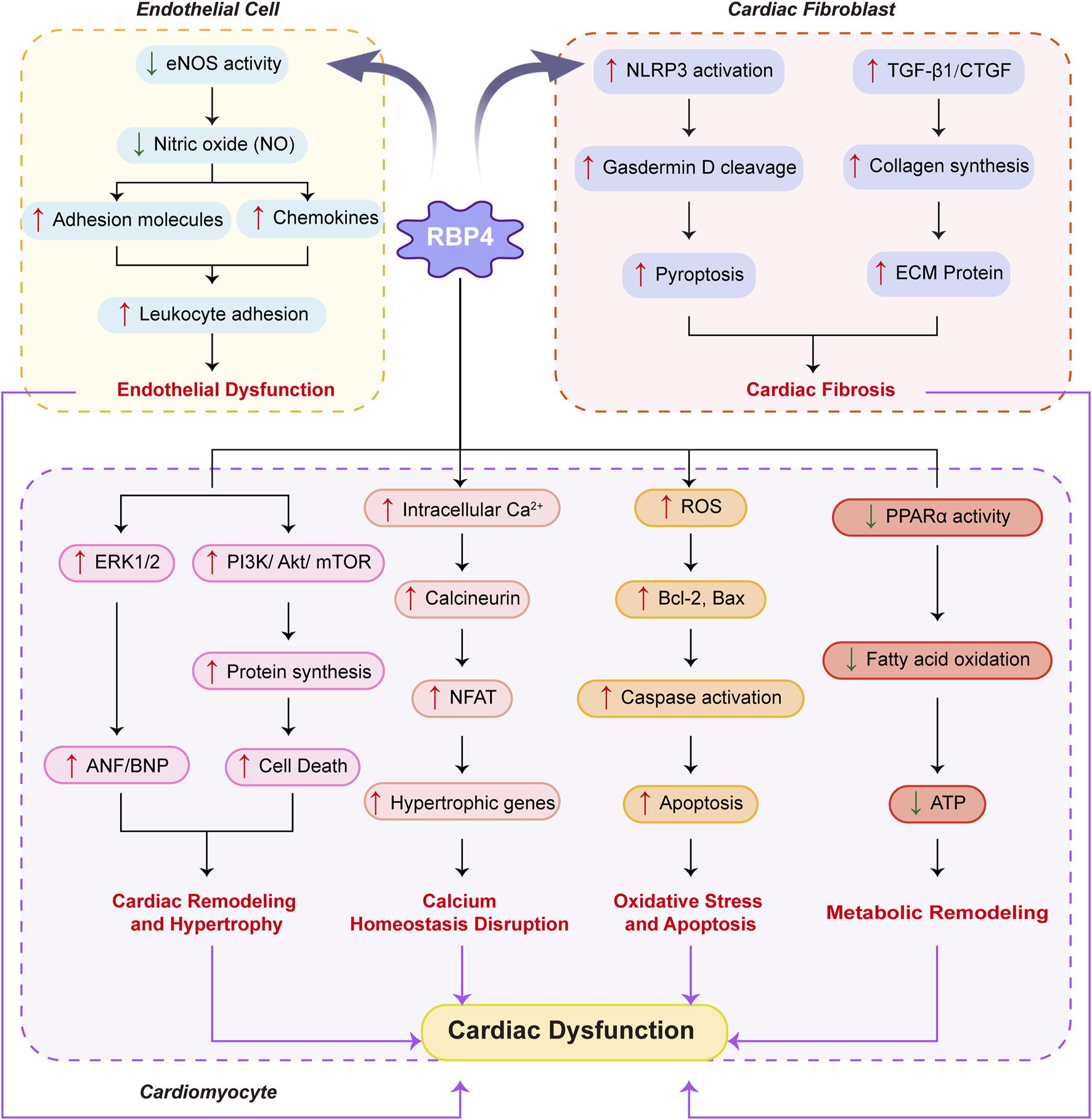 Molecular mechanisms by which RBP4 affects cardiac muscle.Schematic representation of how RBP4 mediates cardiac dysfunction through its effects on endothelial cells, cardiac fibroblasts, and cardiomyocytes. In endothelial cells, RBP4 decreases eNOS activity and NO production, leading to increased adhesion molecules and chemokines, resulting in enhanced leukocyte adhesion and endothelial dysfunction. In cardiac fibroblasts, RBP4 activates NLRP3 inflammasome and increases TGF-β1/CTGF expression, promoting gasdermin D cleavage, pyroptosis, collagen synthesis, and ECM protein production, ultimately causing cardiac fibrosis. In cardiomyocytes, RBP4 triggers four major pathological pathways: (1) Cardiac remodeling and hypertrophy through activation of ERK1/2 and PI3K/Akt/mTOR signaling, leading to increased ANF/BNP expression and protein synthesis; (2) Calcium homeostasis disruption via increased intracellular Ca2+ and calcineurin/NFAT signaling, inducing hypertrophic gene expression; (3) Oxidative stress and apoptosis through elevated ROS production, Bcl-2/Bax dysregulation, and caspase activation; and (4) Metabolic remodeling via decreased PPARα activity, resulting in reduced fatty acid oxidation and ATP production. These pathological changes collectively contribute to cardiac dysfunction. Blue arrows indicate decreased expression/activity; red arrows indicate increased expression/activity. Solid arrows represent direct effects; dashed lines indicate regulatory relationships.