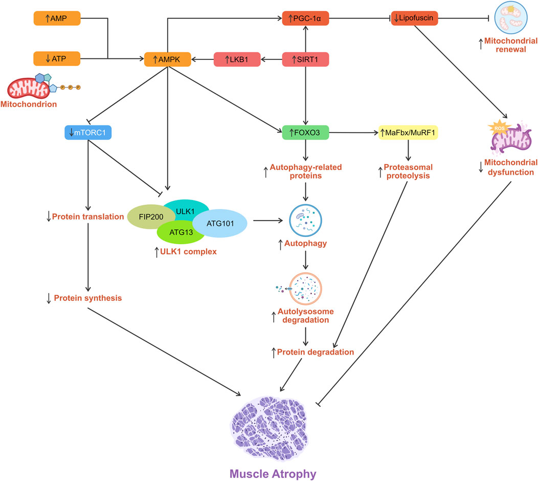 Adenosine 5′-monophosphate (AMP)-activated protein kinase [AMPK, also known as protein kinase AMP-activated alpha 1 catalytic subunit (PRKAA1)] is a central regulator of cellular energy homeostasis, activated under conditions of energy stress such as starvation or exercise (Dossou and Basu, 2019). AMPK and SIRT1 are cellular energy sensors that detect shifts in energy status. Activated AMPK and SIRT1 can directly promote PGC-1α activity through phosphorylation and deacetylation, respectively (Yang et al., 2024). PGC-1α subsequently drives the transcription of genes essential for oxidative metabolism and mitochondrial maintenance. This integrated network optimizes energy expenditure, enhances metabolic fitness, and preserves muscle function throughout the aging process (Ferri et al., 2020). The AMPK/SIRT1/PGC-1α pathway in skeletal muscle is thought to reduce mitochondrial dysfunction and mitigate sarcopenia (Tian et al., 2019).