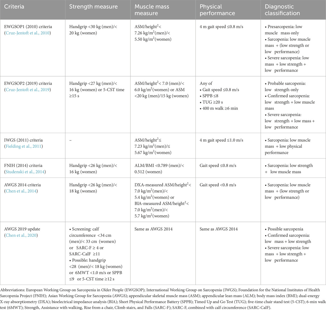 The European Working Group on Sarcopenia in Older People first published diagnostic criteria in 2010 (EWGSOP1) (Cruz-Jentoft et al., 2010) and revised them in 2019 (EWGSOP2) (Cruz-Jentoft et al., 2019). The EWGSOP2 framework redefines sarcopenia as a progressive muscle disease that can begin earlier in life and is driven by factors beyond chronological aging. It elevates low muscle strength as the primary diagnostic parameter, with muscle quantity and physical performance serving as supportive measures. Clear cutoff points are provided to streamline both diagnosis and treatment.