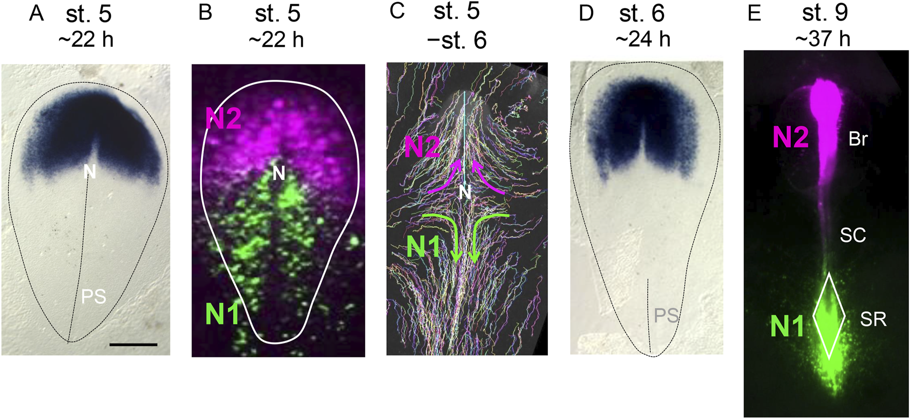 Figure 1. Developmental stage-dependent changes in the Otx2 expression domains, N1 and N2 Sox2 enhancer coverage, and cell trajectories in the gastrulation-stage epiblast. The embryonic stages were defined according to Hamburger and Hamilton (1951). Approximate periods for embryos to reach these stages under stable incubation at 38°C are indicated. The bar indicates 500 µm. (A) The expression profile of Otx2 in a st. 5 chicken embryo, as determined using in situ hybridization. Susan Chapman produced data and deposited it in GEISHA database (Antin et al., 2014). The data was reproduced with permission from both parties. The contour of the area pellucida, which primarily develops into embryonic tissues, and the primitive streak position are indicated by the auxiliary broken lines.The anterior direction is toward the top. N, node; PS, primitive streak. (B) Activity of the N1 and N2 enhancers of the Sox2 gene in stage 5 epiblast cells, as visualized by N1-EGFP and N2-mRFP vector electroporation. The N2 enhancer is active in the wide anterior epiblast area. Because N2 enhancer activation depends on the binding of Otx2 to the enhancer sequence (Iwafuchi-Doi et al., 2012), N2 activity reflects Otx2 expression. The N1 enhancer activity initially covers the posterior epiblast broadly with minimal overlap with the N2 enhancer-active anterior epiblast. (C) Trajectories of epiblast cells from st. 5 to st. 6, visualized using the Supernova cell labeling vector cocktail (Yoshihi et al., 2022a). N2 enhancer-active anterior epiblast cells mostly gather at the midline and migrate anteriorly to form brain tissues. N1 enhancer-active posterior epiblast cells migrate toward the midline and then posteriorly. (D) The Otx2 expression profile of a st. 6 chicken embryo, as determined using in situ hybridization. Susan Chapman produced data and deposited it in GEISHA database (Antin et al., 2014). Otx2 is strongly expressed within an ∼1 mm-wide region in the anteromedial part of the epiblast, which later develops into brain tissues. Lateral to this region, a pair of Otx2-weak epiblast regions are formed, which later develop into the anterior surface ectoderm (Yoshihi et al., 2022a). The N2 enhancer activity at st. 6 aligns with the Otx2 expression profile, high in the brain-forming region but low in the head ectoderm-forming region. (E). Distribution of cells with N1 and N2 enhancer activity in an embryo at st. 9. Br, brain; SC, spinal cord (at this stage, the cervical spinal cord); SR, sinus rhomboidalis. The data in (B,C) were from Konya et al. (2024) and Nakamura et al. (2024), respectively.
