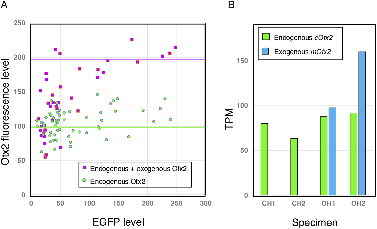Figure 3. Exogenous Otx2 is expressed at a level comparable to that of endogenous Otx2 in brain tissues that develop from electroporated epiblast cells. (A) Brain sections immunostained for EGFP and Otx2, analogous to those in Figures 2B,D, were analyzed by measuring the fluorescence intensities of the same nuclei using Fiji (Schindelin et al., 2012). Otx2 is a highly conserved protein; mouse and chicken Otx2 differ only in one and three positions, respectively, from the immunogen human Otx2 of 289 amino acid residues. Therefore, cOtx2 and mOtx2 should be bound equally by the antibodies. Otx2 fluorescence in the low-EGFP range (<20) was assumed to be comparable in both samples (minimal contribution from exogenous Otx2) and equalized. Then, the scatter plots from both samples were compared. The exogenous Otx2 expression level, even in samples with high total Otx2 expression, was not greater than the endogenous Otx2 expression level. (B) Transcriptome analysis of the midbrain-hindbrain region of the brain at st.10–11, explained in Figure 7, distinguished transcripts of exogenous mOtx2 (mouse Otx2) from those of endogenous cOtx2 (chicken Otx2). Two embryo samples, each consisting of a pool of four embryos, were prepared for the control (chicken Otx2 only, CH1 and CH2) and the Otx2 group (chicken and mouse Otx2, OH1 and OH2). TPMs averaged for four embryo samples are presented. The control embryos did not display any mouse Otx2 transcripts. In the OH1 and OH2 samples, exogenous mouse and endogenous chicken Otx2 were expressed at comparable levels in terms of transcripts per kilobase million (TPMs).
