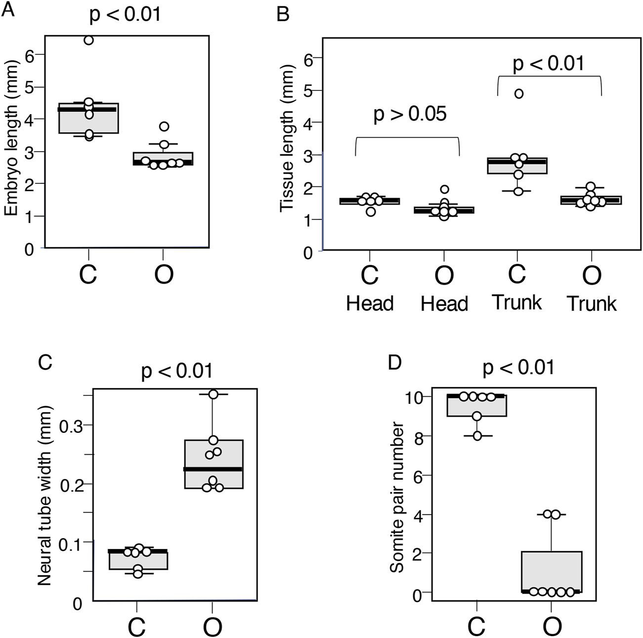 Figure 4. Boxplot representation of the morphological features of embryos that developed following exogenous Otx2 expression at stages 9–10. C group: Data from six control embryos. O group: Data from seven embryos with exogenous Otx2 expression. (A) Embryo length. Averages were 4.42 mm for C and 2.86 mm for O. p = 0.0066. (B) The lengths of the head (distance between the embryonic anterior end and the foregut portal) and the trunk (remaining embryonic portion) were assessed separately, indicating that the difference in embryo length was derived primarily from the trunk length. The average head length was 1.50 mm for C and 1.29 mm for O; p = 0.073. The average trunk length was 2.97 mm for C and 1.57 mm for O; p = 0.023. (C) The widths of axial neural tissues were determined using the bright-field images of the embryos. Average widths of axial neural tissue at the axial level 1 mm anterior from the embryo posterior end for the C group embryos and 0.5 mm from the posterior end for the O group embryos: 74 µm for the C group and 251 µm for the O group; p = 0.0026. (D) Somite numbers, p = 0.0017.