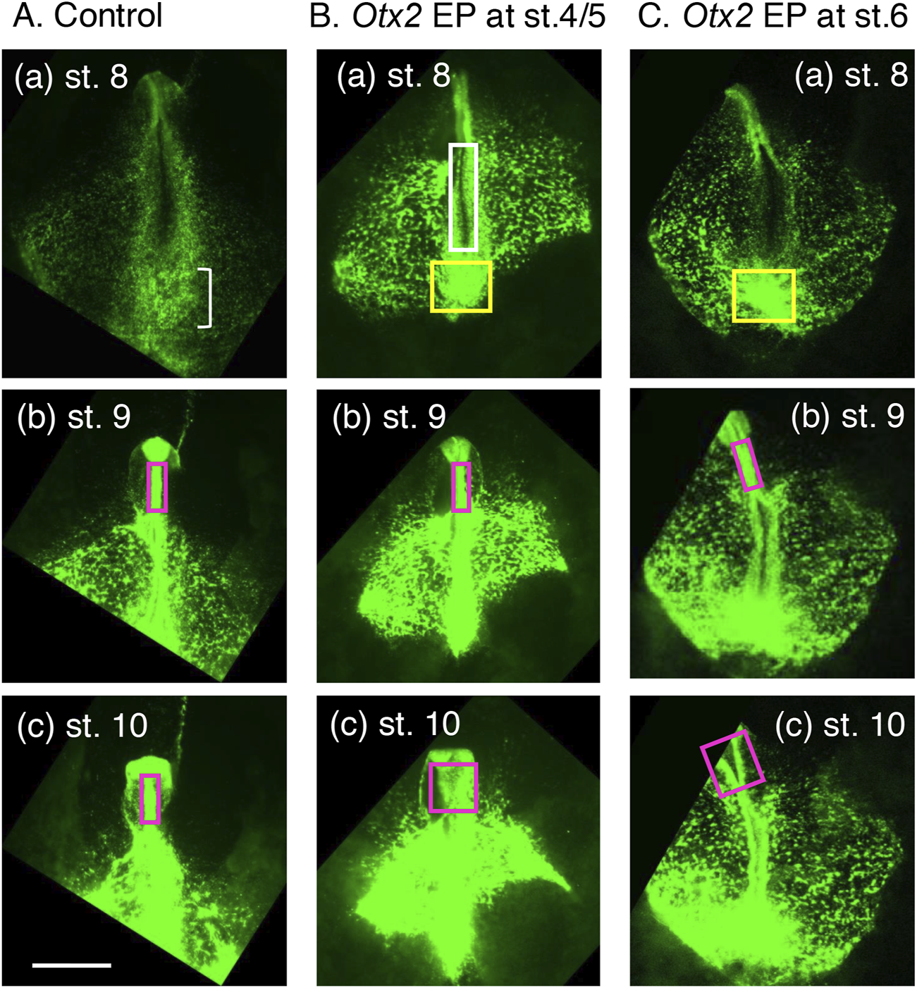 Figure 5. Landmark frames from Supplementary Movies S1–S3 showing the critical cellular events accounting for the morphological characteristics of embryos electroporated with the exogenous Otx2 expression vector. The image brightness was modified from the original movies. The bar indicates 1 mm. (A) A control embryo with electroporation of EGFP-expressing and insert-free pCAGGS vectors at st. 4/5 (∼19 h of incubation). EGFP fluorescence indicates the migration and accumulation of epiblast cells. (a) At st. 8, when the brain portions started to assume a neural tube, the NMP-derived spinal cord region was still a wide neural plate. The loose cell accumulation indicated by the small bracket forms the sinus rhomboidalis. (b,c) During st. 9 to st. 10, the midbrain and hindbrain portions remain as a narrow neural tube (magenta rectangle). (B) An embryo electroporated with pCAGGS-EGFP and pCAGGS-mOtx2 at st. 4/5. (a) A neural tube was formed precociously at the cervical spinal cord level around st. 8 (∼29 h of incubation), as indicated by the white rectangle, and the cells accumulated at the posterior end of the trunk (yellow rectangle). (b) The midbrain and hindbrain portions remained as a narrow neural tube (magenta rectangle) at st. 9. (c) However, the midbrain and hindbrain portions were widened at st. 10. (C) An embryo electroporated with pCAGGS-EGFP and pCAGGS-mOtx2 at st. 6. (a) The spinal cord-forming neural plate was still open, similar to the control embryo in (A). However, cells accumulated at the posterior end of the trunk (yellow rectangle), similar to the embryo in (B). (b) The midbrain and hindbrain portions remained as narrow neural tubes (magenta rectangles) at st. 9 (∼37 h of incubation). (c) However, the midbrain and hindbrain portions were widened (magenta rectangles) at st. 10 (∼42 h of incubation).