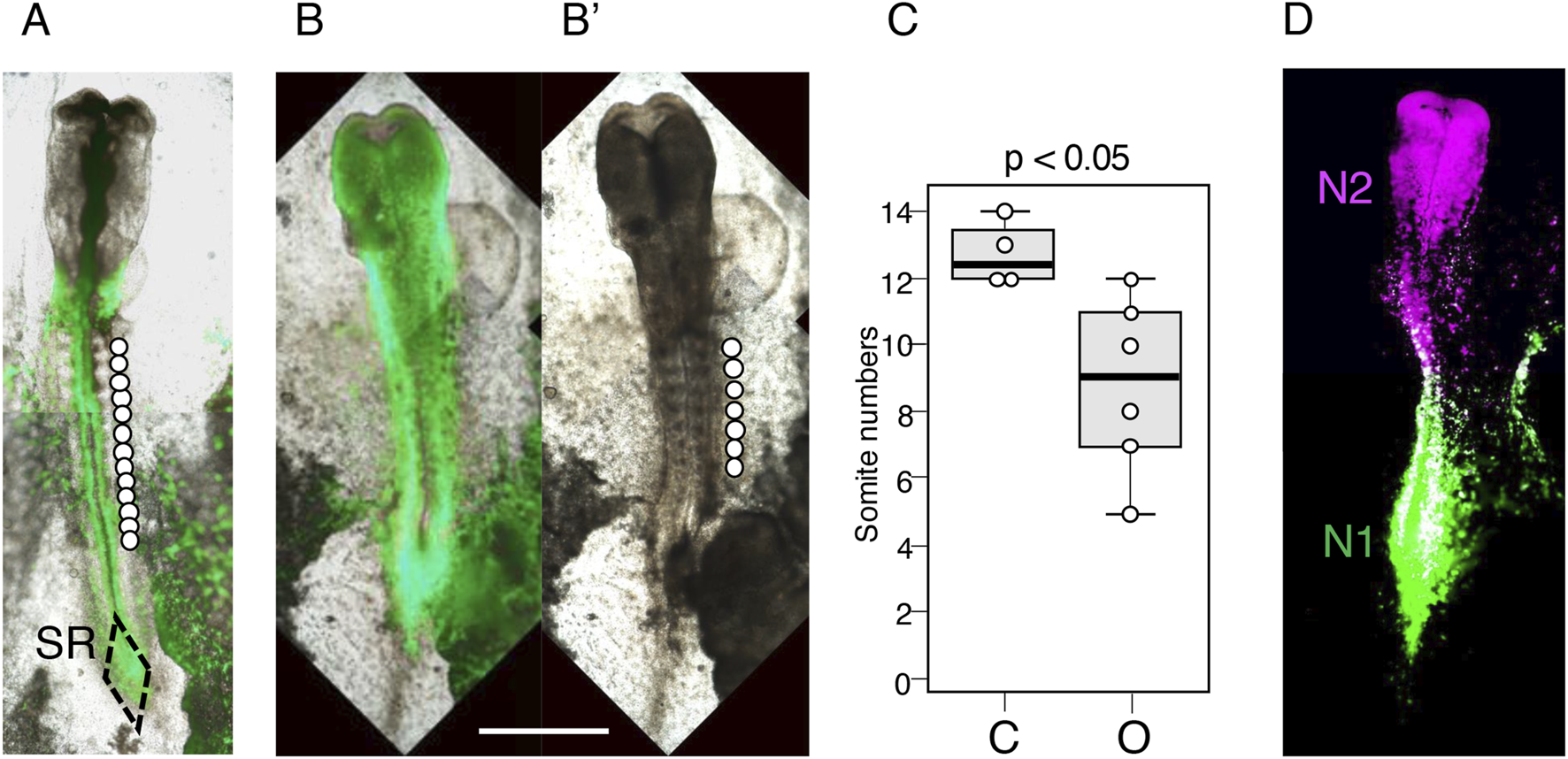 Figure 6. Consequences of electroporating the Otx2 expression vector at st. 6. The embryos were fixed at st. 10–11 (42–45 h of incubation). The bar indicates 1 mm. (A) A control embryo electroporated with pCAGGS-EGFP, with 13 somite pairs indicated by circles placed laterally to the somites. SR, sinus rhomboidalis. (B) An embryo electroporated with pCAGGS-EGFP and pCAGGS-mOtx2 at st. 4, with EGFP fluorescence superimposed on the bright-field image. Note that the midbrain-hindbrain region was flattened, similar to that in embryos with electroporation at st. 4/5 (Figure 2C). (B’) Bright-field image of the same embryo showing the development of seven somite pairs. (C) Statistics of the differences in the somite numbers between four control (C) and six Otx2-electroporated (O) embryos using box plots; p < 0.05. (D) An embryo electroporated with N1-EGFP, N2-mRFP1, and CAGGS-mOtx2 vectors at st. 6 and fixed at st. 11, showing that the N1 and N2 enhancers were unaffected by exogenous Otx2 expression. N1 and N2 enhancer-active cell territories in the epiblast are maintained under exogenous Otx2 expression.