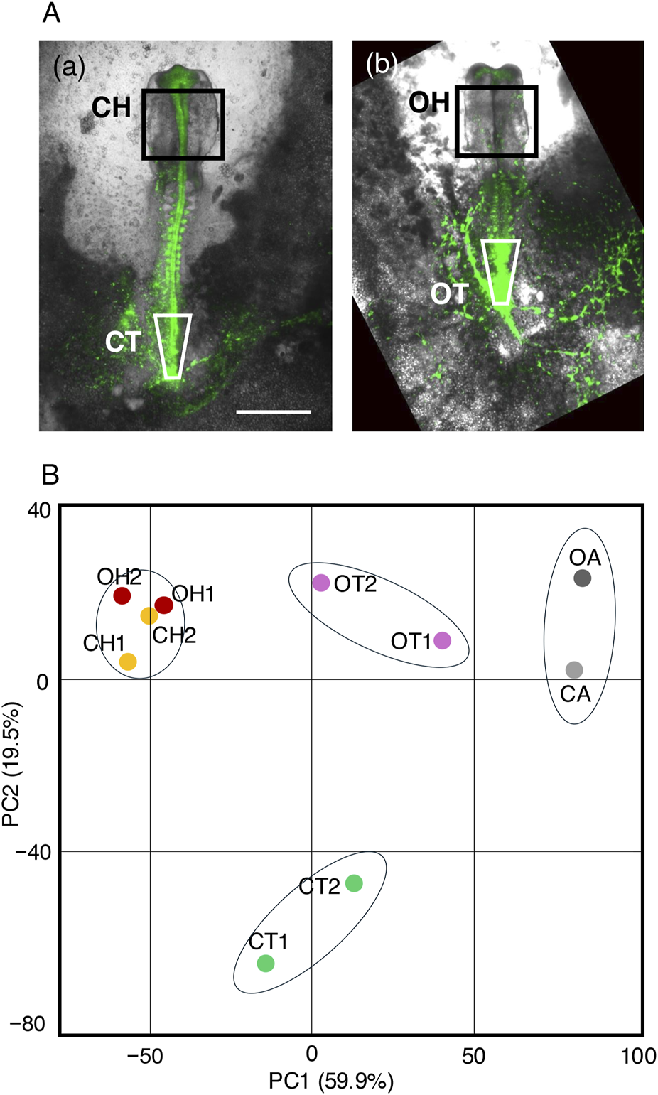 Figure 7. Transcriptome analysis of tissues affected by exogenous Otx2 expression via RNA-seq. (A) The tissues subjected to analysis in normal embryos at st. 10–11 (a) and in Otx2-electroporated embryos of the corresponding stages (b) from the same embryo pool. The bar indicates 1 mm. The CH and OH indicated by the rectangles represent the midbrain-hindbrain regions of the embryos, excluding the forebrain. The CT and OT samples in (a,b) are the sinus rhomboidalis in the control embryos and the corresponding region in Otx2-electroporated embryos. Tissues from four embryos were pooled to prepare a sample for RNA-seq, and duplicate samples, CH1, CH2, etc., were subjected to analysis. (B) PC1‒PC2 chart of the primary component analysis, showing clustering of the transcriptome profiles. Note that CH1, CH2, OH1, and OH2 constitute a tight, inseparable cluster.