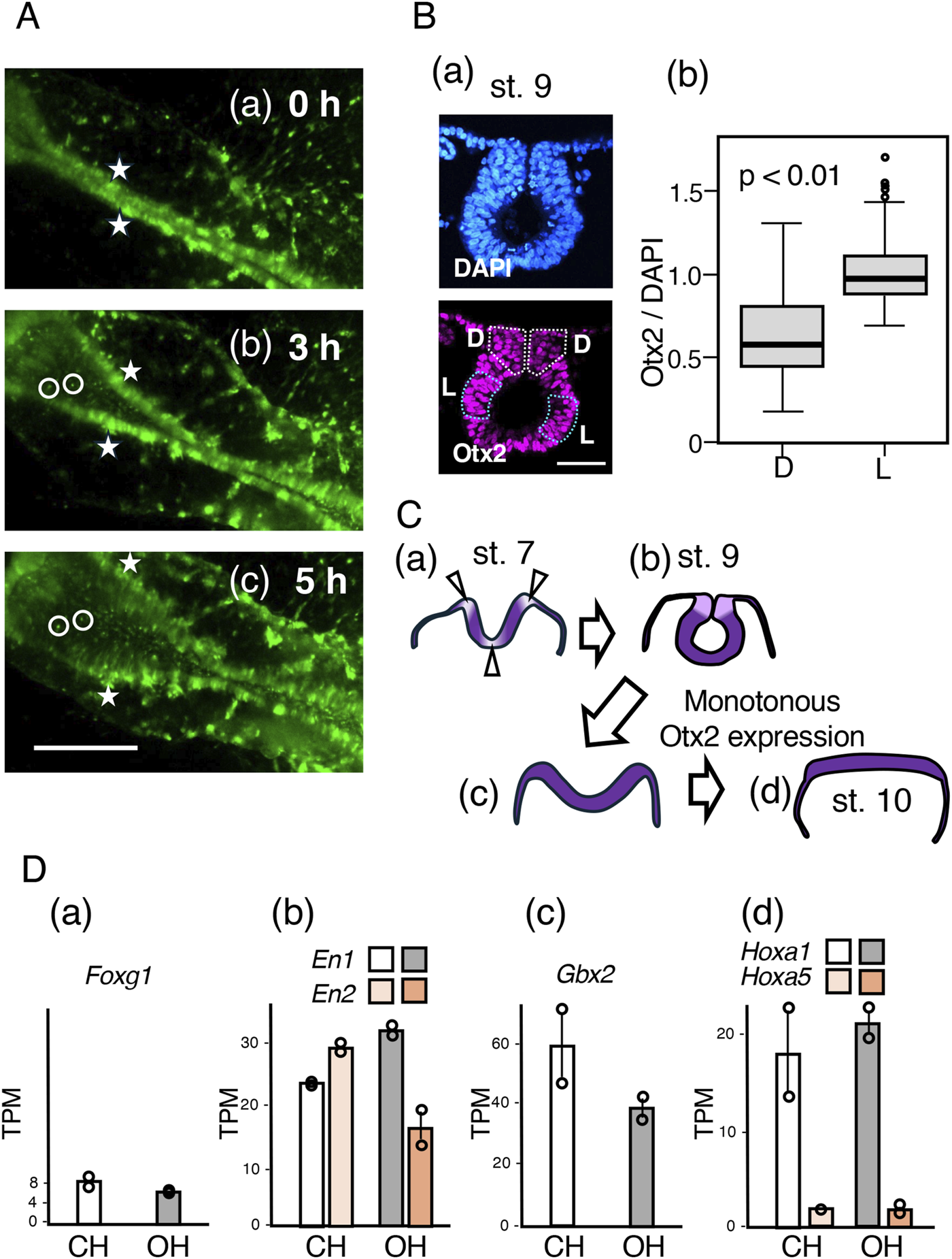 Figure 8. Unzippering of the closed midbrain following exogenous Otx2 expression without altering regional specification. (A) Time-lapse images from st. 9 to 10, covering a 5 h period, of the midbrain portion of an embryo that was electroporated with exogenous Otx2 at st. 4/5. Excerpts from the frames of Supplementary Movie S4. The bar indicates 500 µm. (a) St. 9 (0 h) embryo; a pair of cell clusters on the dorsal end of the closed midbrain neural tube are marked by asterisks. (b) After 3 h, when the opening of the dorsal ends of the neural tube had started, the cell clusters labeled by the asterisk remained on the dorsal ends. Two cells are marked on the side and at the bottom of the curled neural tube. (c) At 5 h, when the embryo reached st. 10, the neural tube was opened widely and flattened. The relative positions of the marked cells and cell clusters did not change (B). (a) A cryosection of the midbrain-forming neural tube at st. 9, stained for nuclear DNA with DAPI (upper panel) and Otx2 immunofluorescence (lower panel). The dorsal area is toward the top. The bar indicates 50 μm. Otx2 expression levels were lower in the dorsal neck regions (D, outlined by white dotted lines) than in the lateral neural tube wall regions (L, outlined by blue dotted lines). (b) Statistics of the nuclear Otx2 immunofluorescence intensity relative to that of DAPI fluorescence, comparing the dorsal neck (D) with the lateral tube wall. A total of 120 nuclei of each dorsal neck (D) and lateral tube wall (L) in four sections at 45 µm intervals along the embryo axis were analyzed. The data indicated that the Otx2 level in the dorsal neck (D) was approximately 60% of that in the lateral tube wall (L); p = 3 × 10−12 according to Weichi’s t-test. (C) Otx2 downregulation at the bending positions of the midbrain neural plate (a,b) and the effect of exogenous Otx2, which opens and flattens the neural tube (c,d). (D) The transcriptome data of the CH and OH samples collected as detailed in Figure 7 and represented as TPM. The data of duplicate samples are presented as circles, and the averages are presented as bars. The transcript levels of Foxg1 (forebrain), En1/En2 (midbrain), Gbx2 (hindbrain), Hoxa1 (hindbrain), and Hoxa5 (cervical spinal cord) were not significantly affected by the exogenous expression of Otx2.