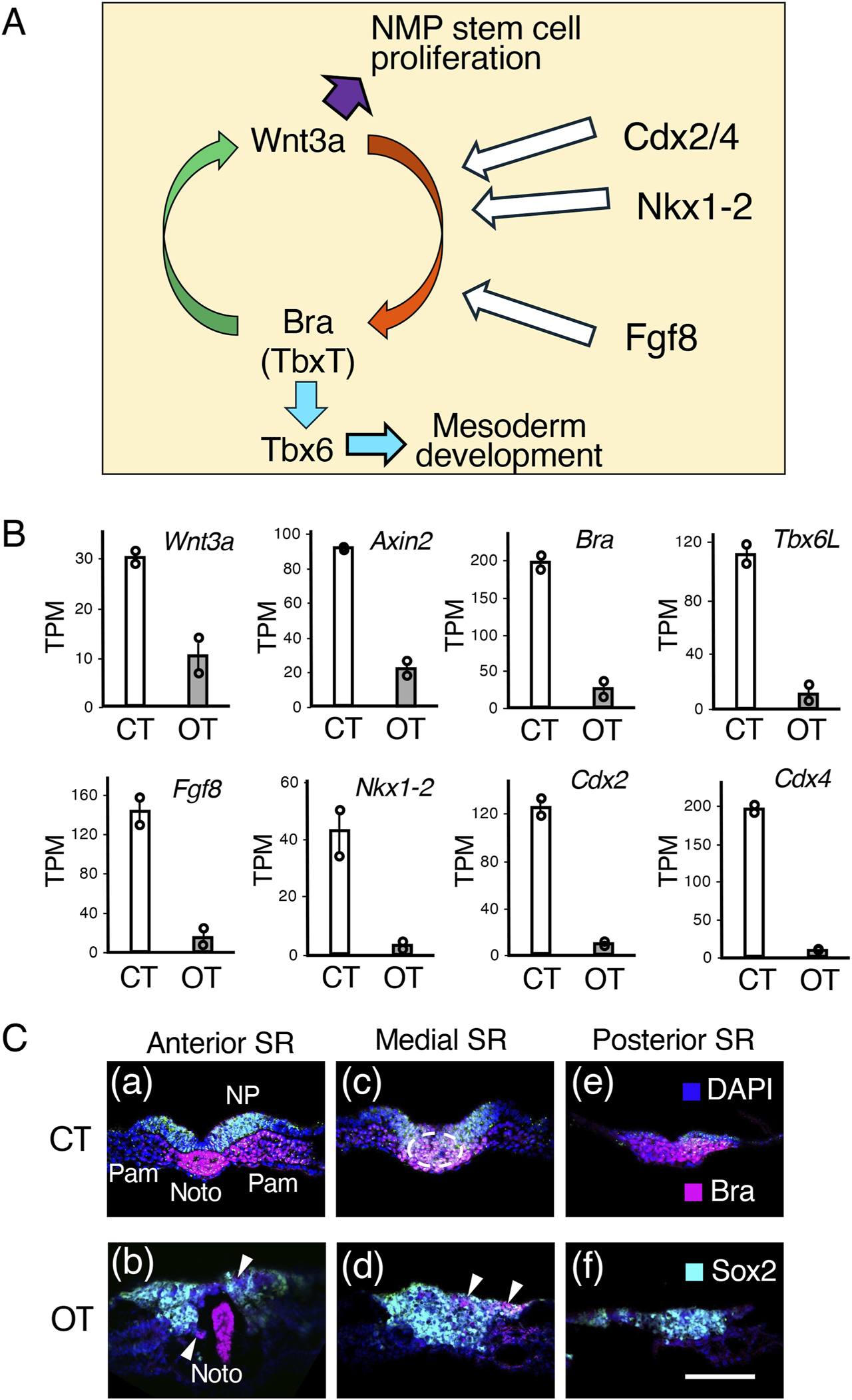 Figure 9. Molecular and cellular events in the sinus rhomboidalis are strongly affected by ectopic Otx2 expression in the posterior epiblast. (A) Wnt3a and Bra (TbxT) coregulatory loop that promotes NMP stem cell proliferation and allows (paraxial) mesodermal development via Bra→Tbx6 regulatory cascades. The activity of the transcription factors Nkx1-2, Cdx2, and Cdx4, and signaling of Fgf8, which are expressed in and around the sinus rhomboidalis, is essential for driving the Wnt3a-Bra regulatory loop and downstream processes. References are given in the main text. (B) Transcriptome data comparing the sinus rhomboidalis region of the control (CT) and exogenous Otx2 (OT) embryos, as indicated in Figure 7. The TPM data of duplicate samples are presented as circles, and the averages are presented as bars. The Sox2 and Sox1 expression levels were similar between the control embryos and those expressing exogenous Otx2 at around 19 and 1.2 TPM, respectively. (C) Cross cryosections of control (CT) and exogenous Otx2 (OT) embryos in the sinus rhomboidalis (SR) region immunostained for Sox2 and Bra and subjected to nuclear staining with DAPI. The panels are arranged in anterior-to-posterior order. The axial levels of the sections are indicated on top of the panels. The arrowheads in (b,d) indicate the small patches of Bra-expressing cells remaining in the embryos expressing exogenous Otx2. The dorsal side is toward the top. The bar indicates 100 µm. Noto, notochord; NP, neural plate; Pam, paraxial mesoderm.