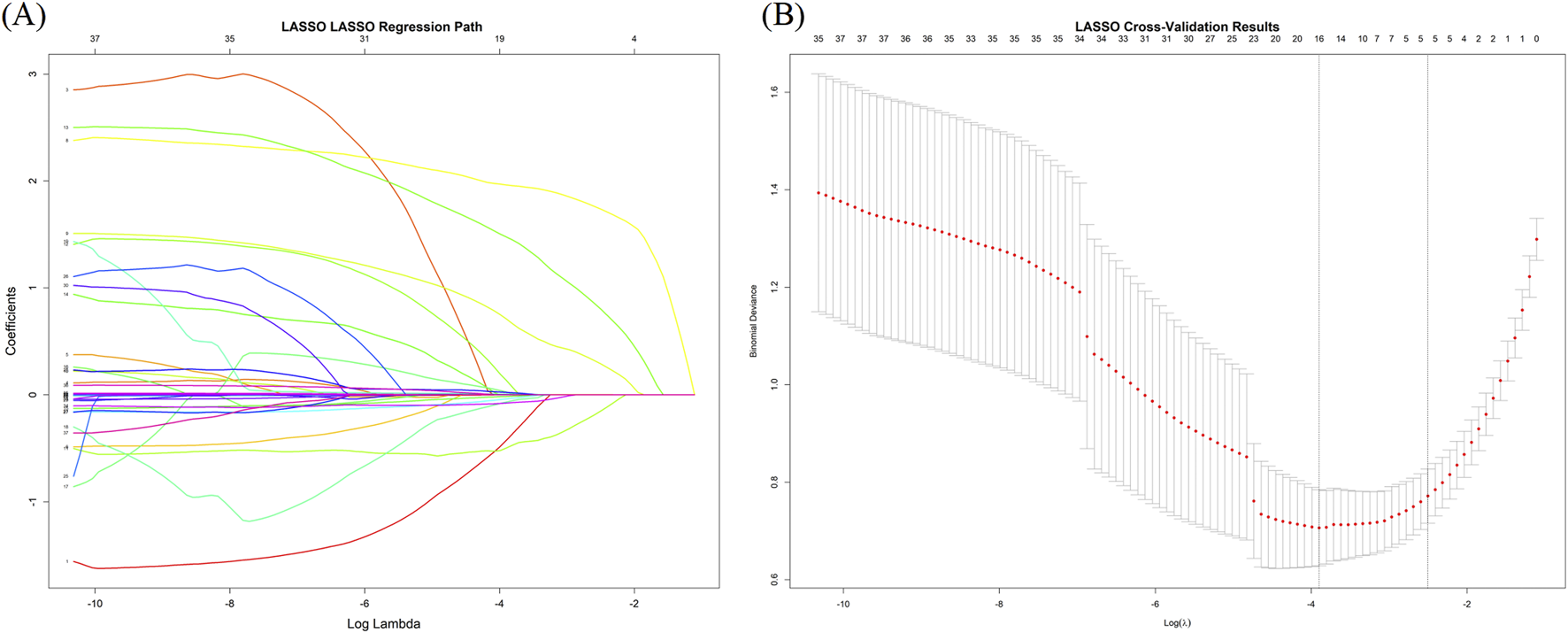 LASSO applies a penalty to regression coefficients, shrinking some to zero and thereby retaining only the most relevant predictors. We used 10-fold cross-validated LASSO (via the cv.glmnet function) to select the optimal regularization parameter (λ). The final λ value was determined using the 1-standard error (1-SE) rule (lambda.1se), and variables corresponding to non-zero coefficients were selected as candidate predictors. The final features included in the machine learning models were determined by combining variables identified by both univariate logistic regression and LASSO regression.