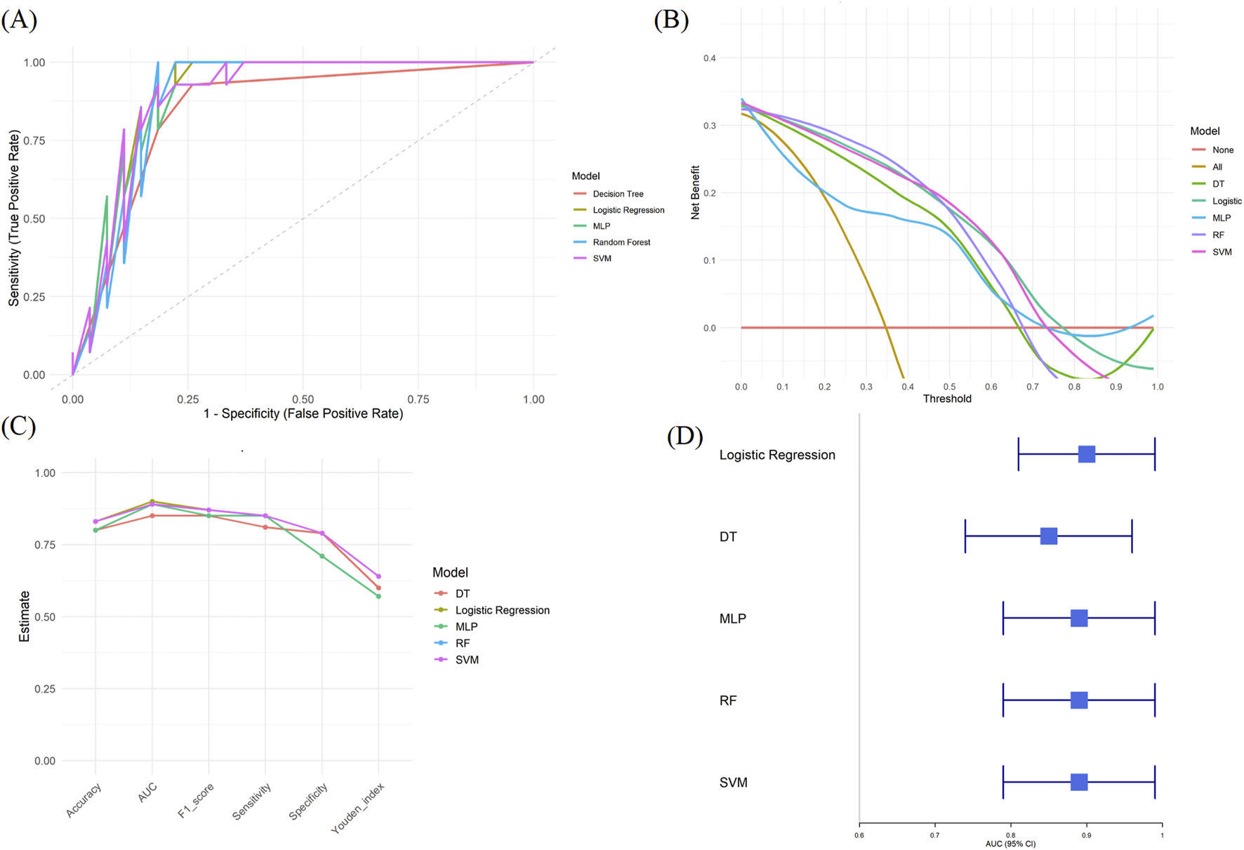 Several machine learning algorithms were used to build predictive models, including decision tree (DT), logistic regression, multilayer perceptron (MLP), random forest (RF), and support vector machine (SVM). The dataset was randomly split into a training cohort (80%) and an internal validation cohort (20%).