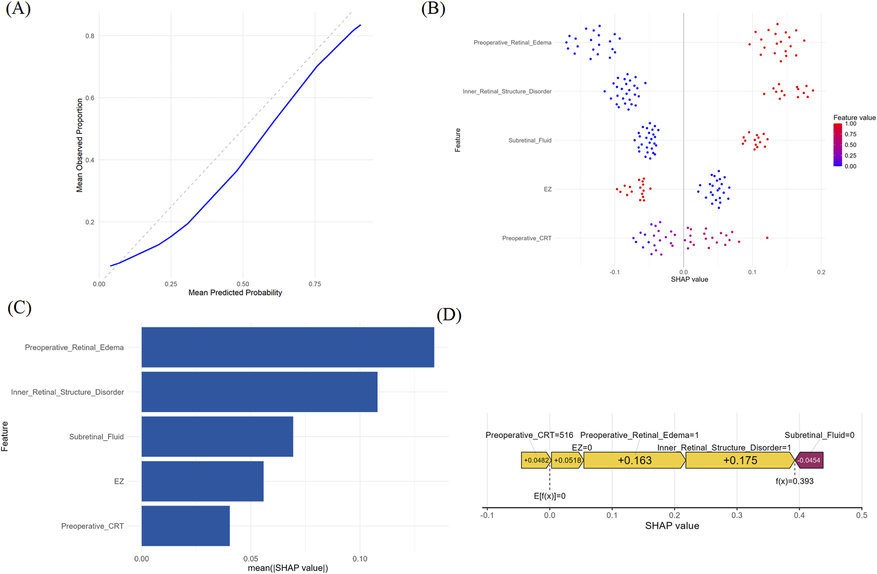 Among the 37 baseline variables, five key predictors were identified: preoperative CRT >400 μm, presence of retinal edema, presence of subretinal fluid (SRF), disorganization of the inner retinal layers (DRIL), and ellipsoid zone (EZ) integrity. The logistic regression model achieved the best performance with an accuracy of 0.83, sensitivity of 0.85, specificity of 0.79, and an AUC of 0.90 (95% CI: 0.81–0.99). SHAP analysis revealed that preoperative retinal edema, DRIL, SRF, and CRT had the strongest positive contributions, while intact EZ was a negative predictor of CRT reduction. A nomogram was developed to facilitate individualized clinical decision-making.