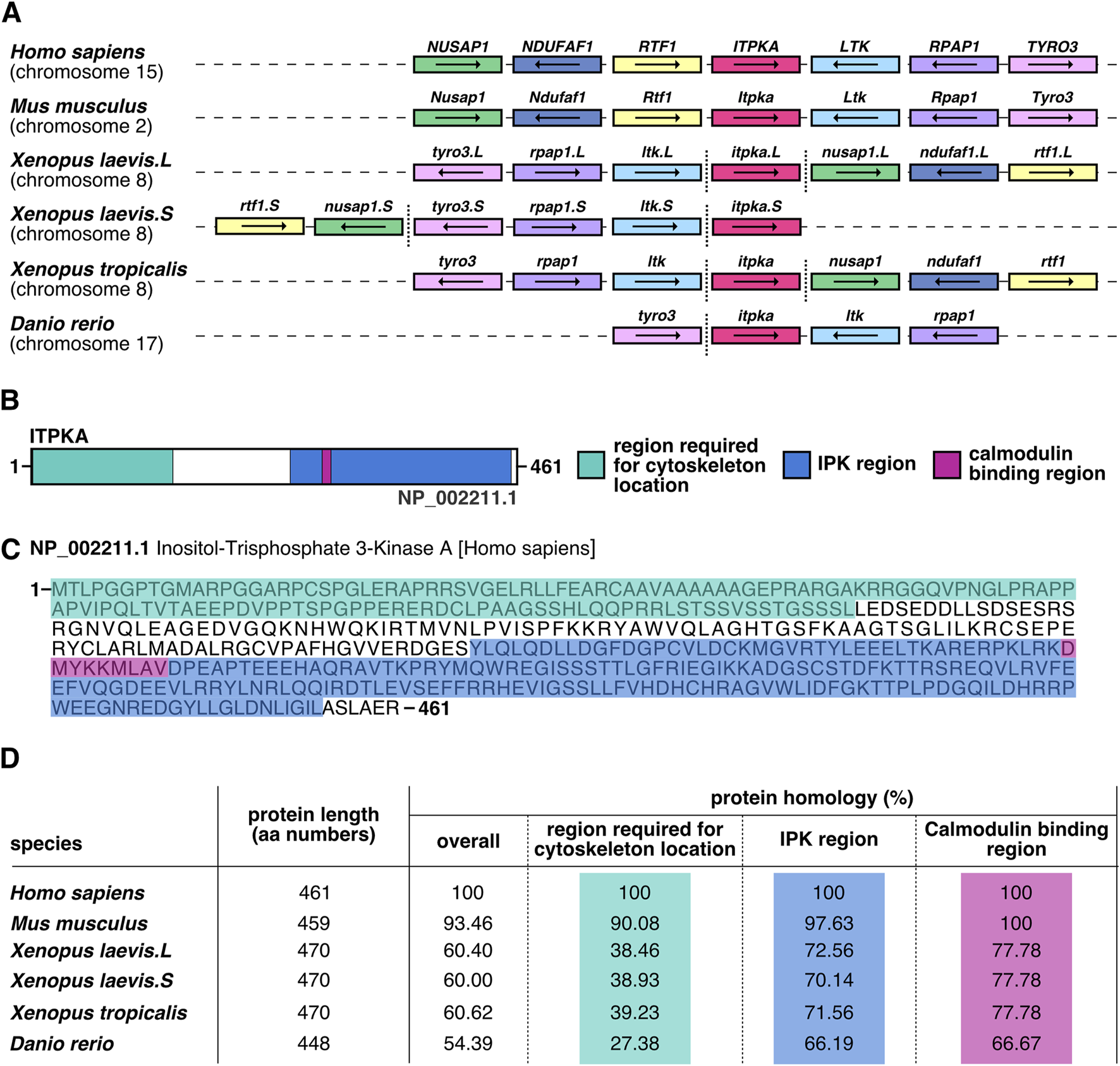 Figure 1. In silico analysis of itpka reveals a strong conservation across species. (A) Synteny analysis of itpka genes’ location and its neighboring genes among different species such as Homo sapiens, Mus musculus, Xenopus laevis, Xenopus tropicalis and Danio rerio. Conserved genes are depicted by boxes with identical colors, itpka is shown in red. Non-conserved neighboring genes are not shown. The orientations of the open reading frames are indicated by arrows. Gene lengths and the distances are not proportional to their actual size. More distanced genes on the same chromosome are emphasized by a vertical dashed line. Chromosomal location is listed below the species name. X. laevis L or S chromosome is specified next to the gene name. (B) Schematic representation of human ITPKA. Region required for cytoskeleton location (green), IPK region (blue) and calmodulin binding region (pink) are shown. (C) Human ITPKA protein sequence. Amino acid (aa) sequence is shown. The region required for cytoskeleton location (green), IPK region (blue) and calmodulin binding region (pink) are marked. (D) Homology of the aa sequences of full-length ITPKA among different species. Aa length is given in numbers. Percentages represent identical residues (percent identity) of the indicated species compared to Homo sapiens. Abbreviation: aa, amino acid; IPK, inositol polyphosphate kinases; itpka, inositol 1,4,5-trisphosphate 3-kinase A; LTK, leukocyte receptor tyrosine kinase; NDUFAF1, NADH:ubiquinone oxidoreductase complex assembly factor 1; NUSAP1, nucleolar and spindle associated protein 1; RPAP1, RNA polymerase II associated protein 1; RTF1, RTF1 homolog, Paf1/RNA polymerase II complex component; TYRO3, TYRO3 protein tyrosine kinase.