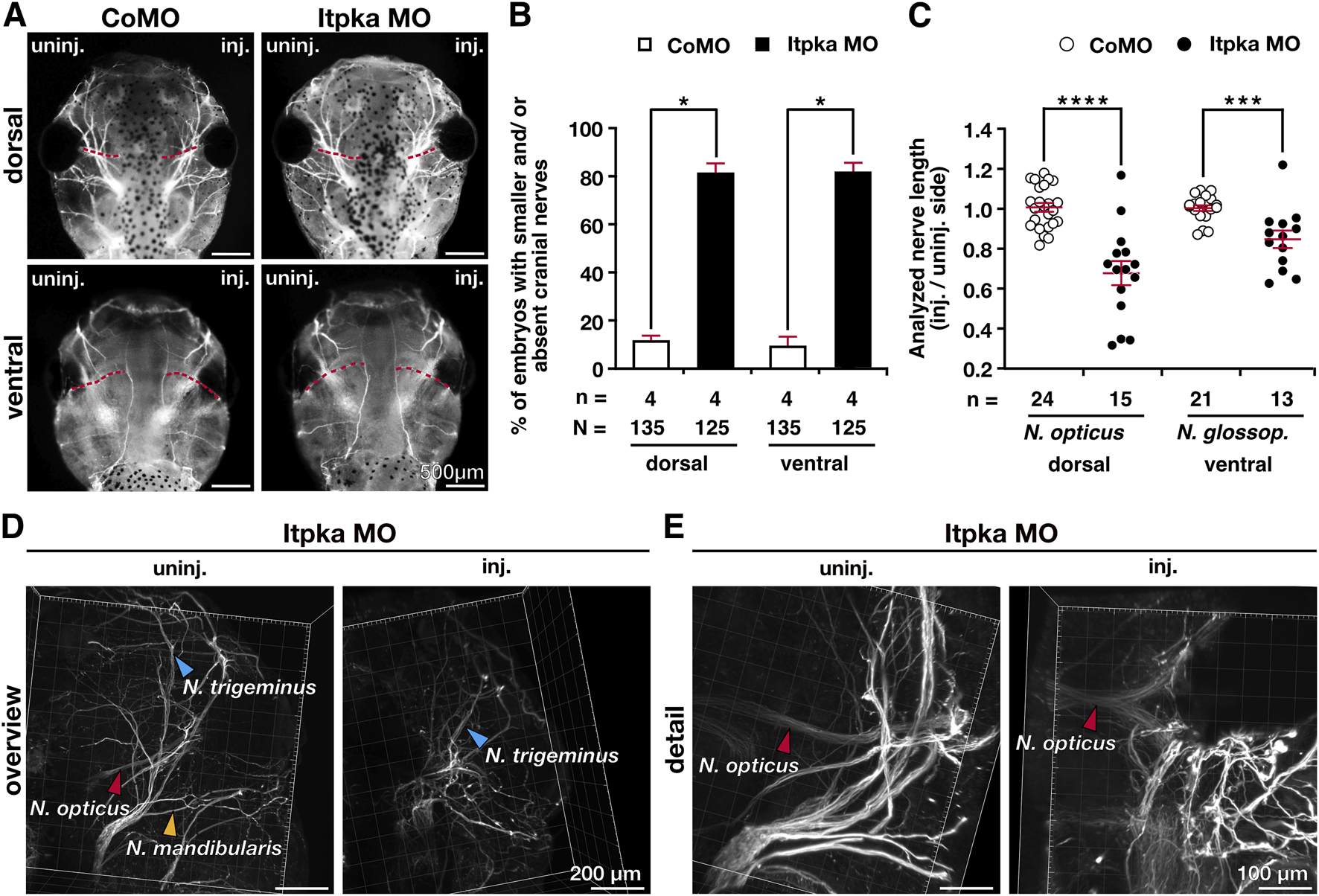 Figure 5. Itpka knockdown results in malformed cranial nerves. (A) Dorsal and ventral views of CoMO- and Itpka MO-injected embryos show the branching of cranial nerves upon Itpka MO KD visualized by 3A10 antibody staining. (B) Statistical evaluation of embryos with shortened or absent branching of cranial nerves as illustrated in (A). (C) Statistical analysis of cranial nerve length of the Nervus opticus (N. opticus) and the Nervus glossopharyngeus (N. glossop.) illustrated in (A). (D,E) Confocal images of an Itpka MO-injected embryo are shown. An overview (D) of the stained Nervus opticus (N. opticus), Nervus trigeminus (N. trigeminus) and Nervus mandibularis (N. mandibularis) and a detailed view (E) of the stained Nervus opticus (N. opticus). Abbreviations: CoMO, control morpholino oligonucleotide; inj., injected; itpka, inositol 1,4,5-trisphosphate 3-kinase A; KD, knockdown; µm, micrometer; MO, morpholino oligonucleotide; st., stage; uninj., uninjected. Error bars indicate standard errors of the means. *, p ≤ 0.05; ***, p ≤ 0.001; ****, p ≤ 0.0001.