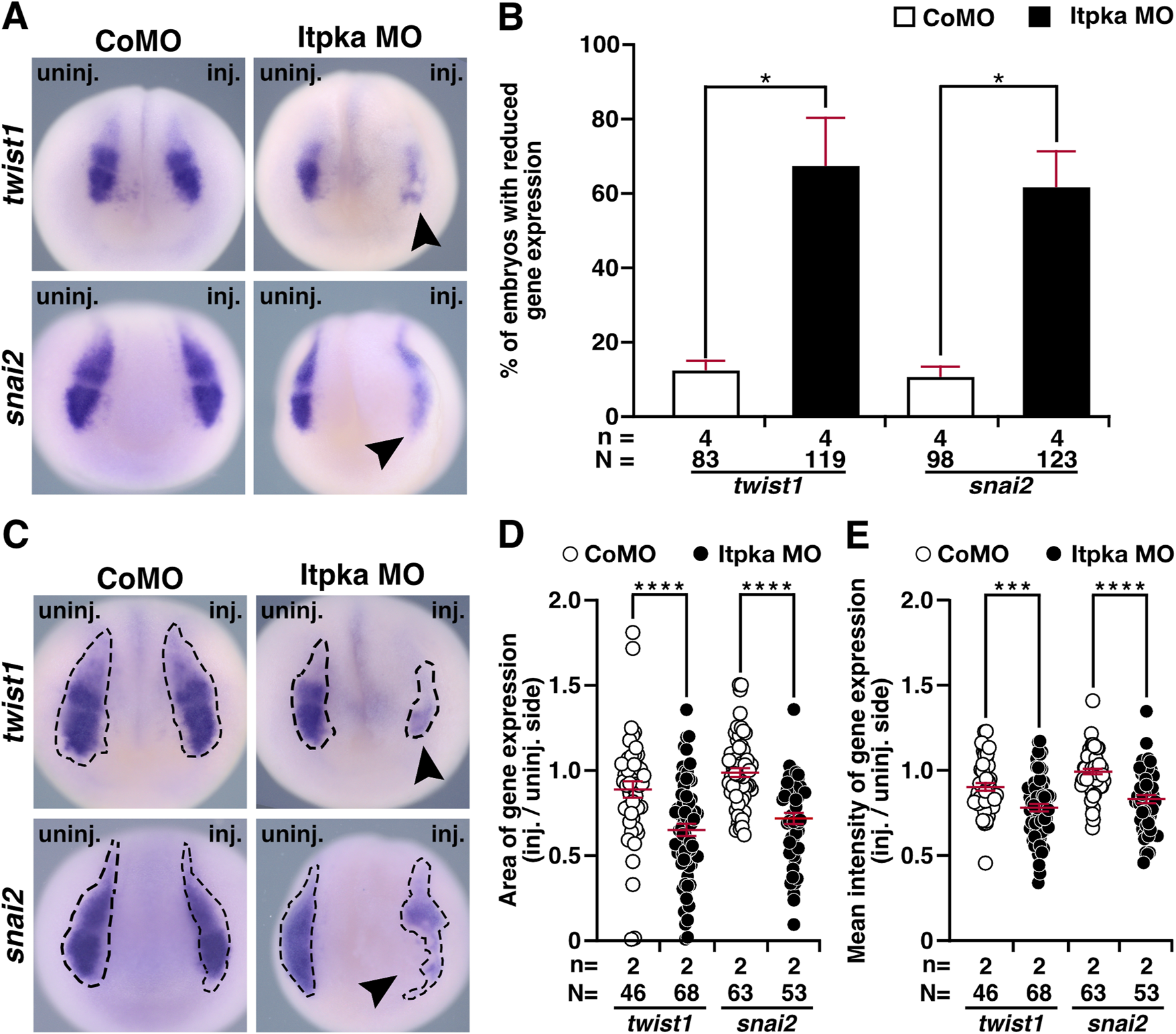 Figure 6. Itpka MO injection impairs neural crest cell induction and migration at stage 15. (A) Anterior view of CoMO- and Itpka MO-injected embryos at stage 15 after whole mount in situ hybridization (WMISH) with NCC-specific genes twist1 and snai2 during NCC induction and migration. Reduced gene expression on the Itpka MO-injected side is indicated by black arrowheads. (B) Statistical evaluation of NCC-specific gene expression as illustrated in (A). (C) Anterior view of CoMO- and Itpka MO-injected embryos at stage 15. The analyzed gene expression area and the area of the measured mean intensity of gene expression of twist1 and snai2 is marked with a dashed line. Reduced gene expression on the Itpka MO-injected side is indicated by black arrowheads. (D) Statistical evaluation of the gene expression area of twist1 and snai2 as illustrated in (C). (E) Statistical evaluation of the mean intensity of gene expression of twist1 and snai2 as illustrated in (C). Abbreviations: CoMO, control morpholino oligonucleotide; inj., injected; MO, morpholino oligonucleotide; n, number of independent experiments; N, number of analyzed embryos in total; itpka, inositol 1,4,5-trisphosphate 3-kinase A; snai2, snail family transcriptional repressor 2; st., stage; twist1, twist family bHLH transcription factor 1; uninj., uninjected; WMISH, whole mount in situ hybridization. Error bars indicate standard errors of the means: *, p ≤ 0.05; ***, p ≤ 0.001; ****, p ≤ 0.0001.