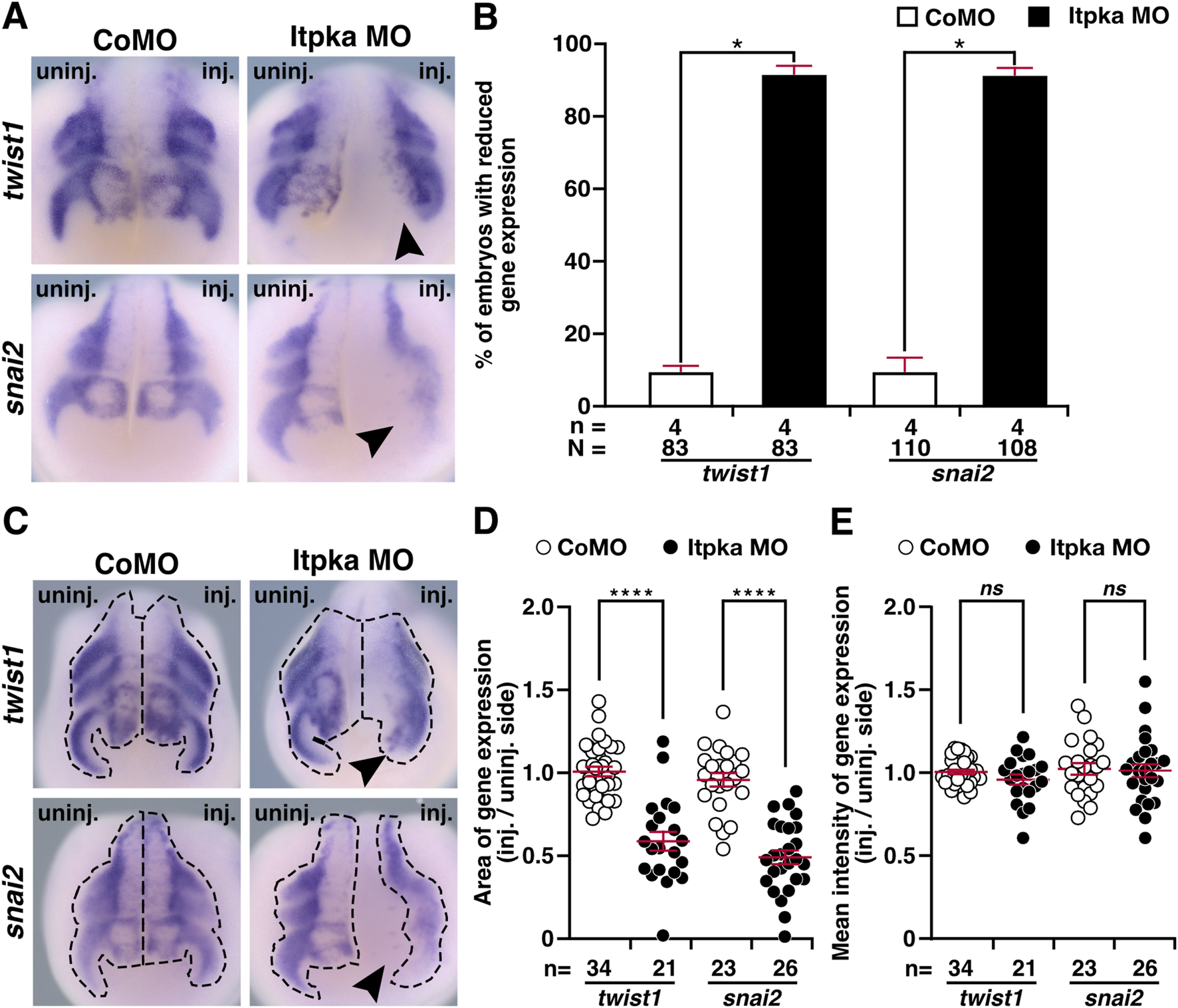 Figure 7. Itpka MO knockdown influences migration of neural crest cells at stage 20. (A) Anterior view of CoMO- and Itpka MO-injected embryos at stage 20 after whole mount in situ hybridization (WMISH) with NCC-specific genes during NCC migration such as twist1 and snai2. Reduced gene expression on the Itpka MO-injected side is indicated by black arrowheads. (B) Statistical evaluation of NCC-specific gene expression as illustrated in (A). (C) Anterior view of CoMO- and Itpka MO-injected embryos at stage 20. The analyzed gene expression area and the area of the measured mean intensity of gene expression of twist1 and snai2 is marked with a dashed line. Reduced gene expression on the Itpka MO-injected side is indicated by black arrowheads. (D) Statistical evaluation of the gene expression area of twist1 and snai2 as illustrated in (C). (E) Statistical evaluation of the mean intensity of gene expression of twist1 and snai2 as illustrated in (C). Abbreviations: CoMO, control morpholino oligonucleotide; inj., injected; MO, morpholino oligonucleotide; n, number of independent experiments; N, number of analyzed embryos in total; ns, non-significant; itpka, inositol 1,4,5-trisphosphate 3-kinase A; snai2, snail family transcriptional repressor 2; st., stage; twist1, twist family bHLH transcription factor 1; uninj., uninjected; WMISH, whole mount in situ hybridization. Error bars indicate standard errors of the means: ns, p > 0.05; *, p ≤ 0.05; ****, p ≤ 0.0001.
