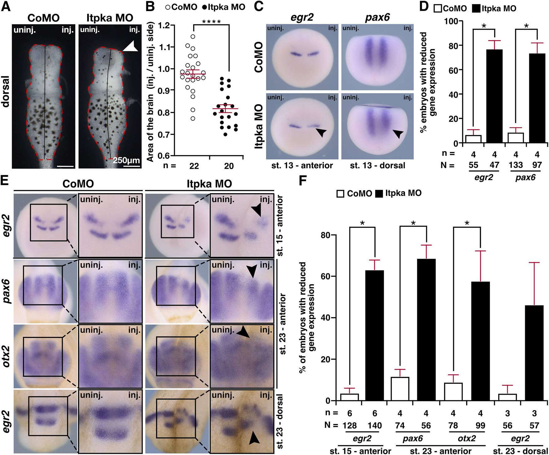 Figure 9. Itpka knockdown affects the development of the brain. (A) Dorsal view of isolated brains from control and Itpka morphants (stage 42). Smaller brain area on the injected side (white arrowhead). (B) Statistical evaluation of the brain area as indicated in (A). (C) Anterior and dorsal view of control MO (CoMO)- and Itpka MO-injected embryos of egr2 and pax6 at stage 13 visualized by whole mount in situ hybridization (WMISH). Reduced expression is indicated by a black arrowhead. (D) Statistical evaluation of the brain-specific gene expression as illustrated in (C). (E) Anterior and dorsal view of CoMO- and Itpka MO-injected embryos at stage 15 and 23 after WMISH with brain-specific genes egr2, pax6 and otx2. Reduced gene expression on the Itpka MO-injected side in the mid- and hindbrain is indicated with black arrowheads. (F) Statistical evaluation of the brain-specific gene expression as illustrated in (E). Abbreviations: CoMO, control morpholino oligonucleotide; egr2, early growth response 2; inj., injected; itpka, inositol 1,4,5-trisphosphate 3-kinase A; µm, micrometer; MO, morpholino oligonucleotide; n, number of independent experiments; N, number of analyzed embryos in total; otx2, orthodenticle homeobox 2; pax6, paired box 6; st., stage; uninj., uninjected; WMISH, whole mount in situ hybridization. Error bars indicate standard errors of the means: *, p ≤ 0.05; ****, p ≤ 0.0001.