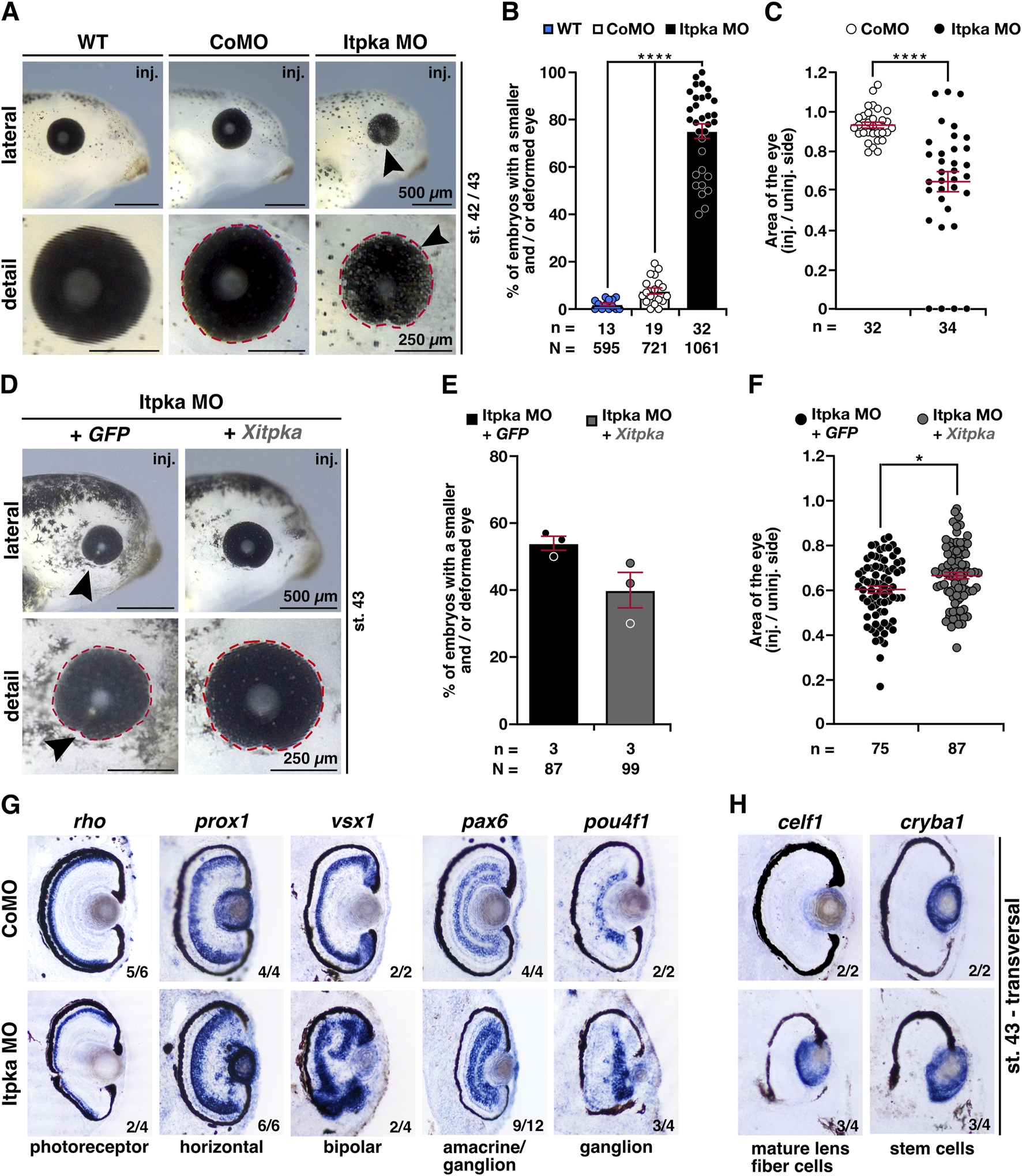 Figure 10. Itpka is required for eye development, while Xitpka rescues the Itpka MO-induced eye phenotype in X. laevis. (A) Lateral and detailed views of a representative wildtype, CoMO and Itpka MO-injected embryos at stage 42/43. Black arrowheads point to smaller eyes. (B) Statistical evaluation of smaller and deformed eyes as shown in (A). (C) Statistical analysis of the eye area (red dashed lines) as illustrated in (A). (D) Lateral and detailed views of Itpka MO-injected embryos in combination with Xitpka-RNA co-injection. Black arrowheads point to smaller eyes. Representative embryos at stage 43 are shown. (E) Statistical evaluation of smaller and deformed eyes as illustrated in (D). (F) Statistical analysis of the eye area (red dashed line) as illustrated in (D). (G) Transversal vibratome sections after whole mount in situ hybridization (WMISH) of Itpka MO-injected embryos at stage 43. Genes for specific cell populations of the retina are used as described in the main text. (H) Lens-specific genes celf1 and cryba1 are also affected. Abbreviations: celf1, CUGBP elav-like family member 1; CoMO, control morpholino oligonucleotide; cryba1, crystallin beta A1; GFP, green fluorescent protein; inj., injected; itpka, inositol 1,4,5-trisphosphate 3-kinase A; MO, morpholino oligonucleotide; n, number of independent experiments; N, number of analyzed embryos in total; pax6, paired box 6; pou4f1, POU class 4 homeobox 1; prox1, prospero homeobox 1; rho, rhodopsin; st., stage; vsx1, visual system homeobox 1; WT, wildtype; Xitpka, Xenopus itpka. Error bars indicate standard errors of the means: *, p ≤ 0.05; ****, p ≤ 0.0001.