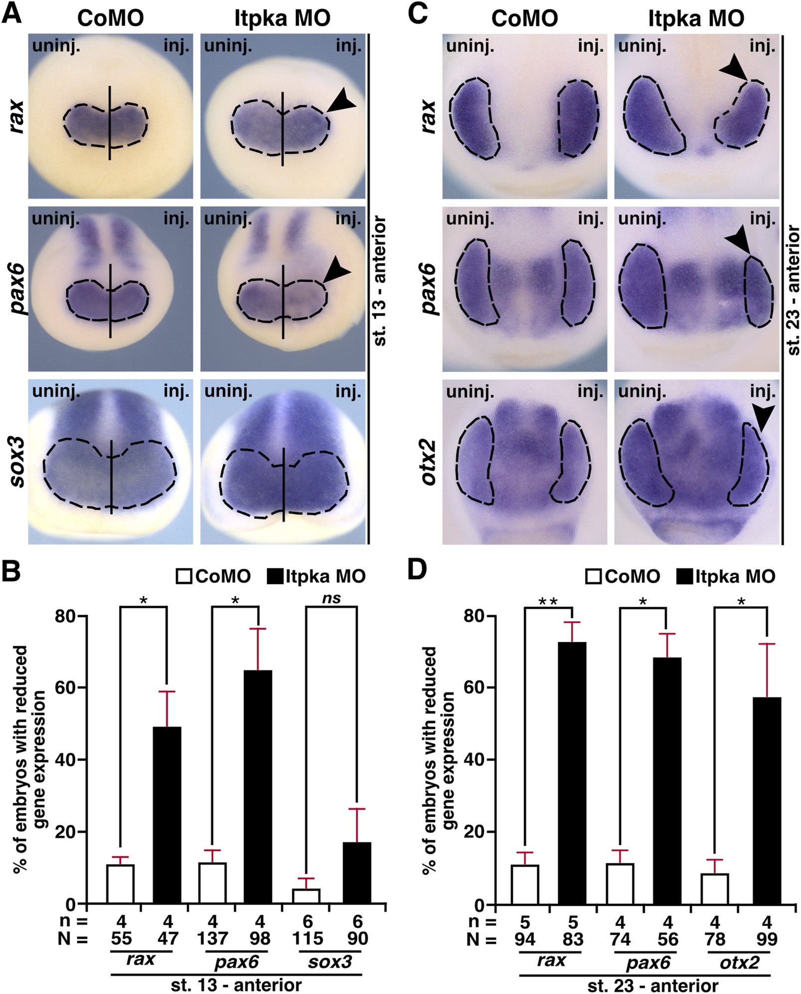 Figure 11. Itpka is necessary for proper differentiation of eye-specific genes in X. laevis. (A) Anterior expression (black dashed line) of the eye-specific genes rax and pax6 as well as the pan-neural marker gene sox3 in control and Itpka morphants at stage 13, during eye field induction, visualized by whole mount in situ hybridization (WMISH). Reduced expression is shown by black arrowheads. (B) Statistical evaluation of embryos with reduced gene expression as described in (A). (C) Anterior view of CoMO- and Itpka MO-injected embryos illustrate eye-specific gene expression (black dashed line) of rax, pax6, and otx2 at stage 23. Black arrowheads show a reduced expression in the developing eye. (D) Statistical evaluation of embryos with reduced gene expression as described in (C). Abbreviations: CoMO, control morpholino oligonucleotide; inj., injected; itpka, inositol 1,4,5-trisphosphate 3-kinase A; MO, morpholino oligonucleotide; n, number of independent experiments; N, number of analyzed embryos in total; ns, non-significant; otx2, orthodenticle homeobox 2; pax6, paired box 6; rax, retina and anterior neural fold homeobox; sox3, SRY-box transcription factor 3; st., stage; uninj., uninjected; WMISH, whole mount in situ hybridization. Error bars indicate standard errors of the means. ns, p > 0.05; *, p ≤ 0.05; **, p ≤ 0.01.