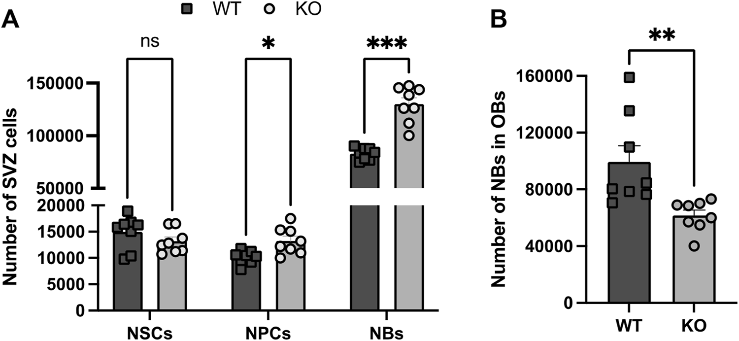 Figure 1. Analysis by FACS of the cellular SVZ and OB composition in WT and Rnd3 KO SVZ (N = 8 per group). (A) Quantification of NSCs (Lin−GLAST+CD24−CD9high), NPCs (Lin−GLAST-CD24−EGFR+ and Lin−GLAST+CD24+EGFR+) and NBs (Lin−GLAST-CD24+), and (B) quantification of the number of NBs in the WT and KO OBs. Data are presented as mean ± SEM. ns: not statistically significant, *p ≤ 0.05, **p ≤ 0.01, ***p ≤ 0.001 vs. WT condition. Lin−: CD45−CD31−TER119−O4−.