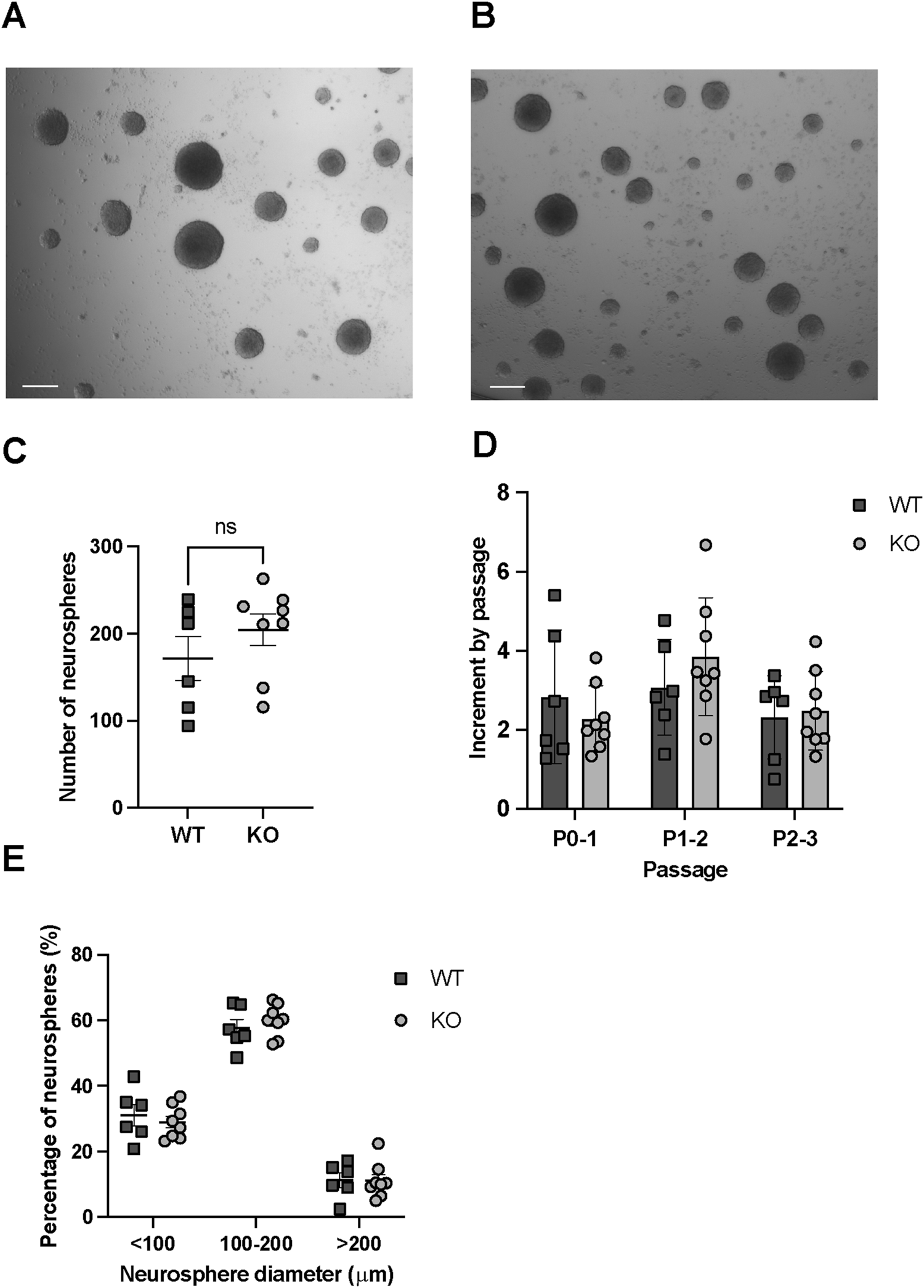 Figure 2. In vitro regeneration and proliferation assays in WT and Rnd3 KO NSCs (N = 6 WT and N = 8 KO). (A) Images of neurospheres obtained from WT and (B) Rnd3 KO NSCs (scale bar: 200 μm). (C) Number of primary neurospheres per well of a 48-well plate formed in self-renewal assays from the primary culture, (D) Fold increase in cell number at each passage (from P0 to P1, from P1 to P2 and from P2 to P3) in WT (N = 6) and Rnd3 KO cultures (N = 8) and (E) classification of neurospheres, formed 6 days after seeding from the primary culture, according to their diameter. Data are presented as mean ± SEM. ns: not statistically significant.
