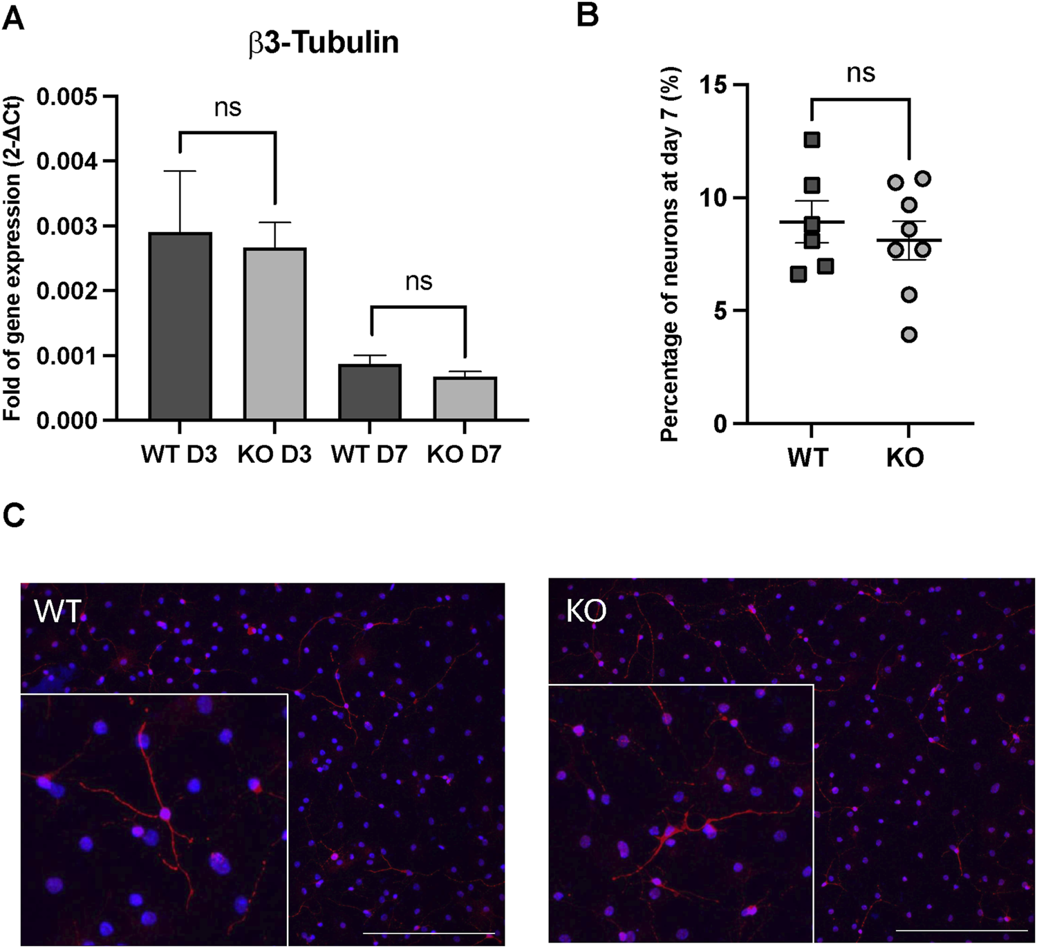 Figure 3. In vitro differentiation assays in WT and Rnd3 KO cultures. (A) Gene expression analysis of β3-tubulin through the differentiation process (at day 3 (D3) and at day 7 (D7)), (B) quantification of neuron percentage at day 7 of the differentiation protocol by immunofluorescence in WT (N = 6) and Rnd3 KO (N = 8) cultures and (C) immunofluorescence imaging of β3-tubulin as a neuronal marker (red) and DAPI for nuclei (blue). Scale bars: 200 µm. Data are presented as mean ± SEM. ns: not statistically significant.
