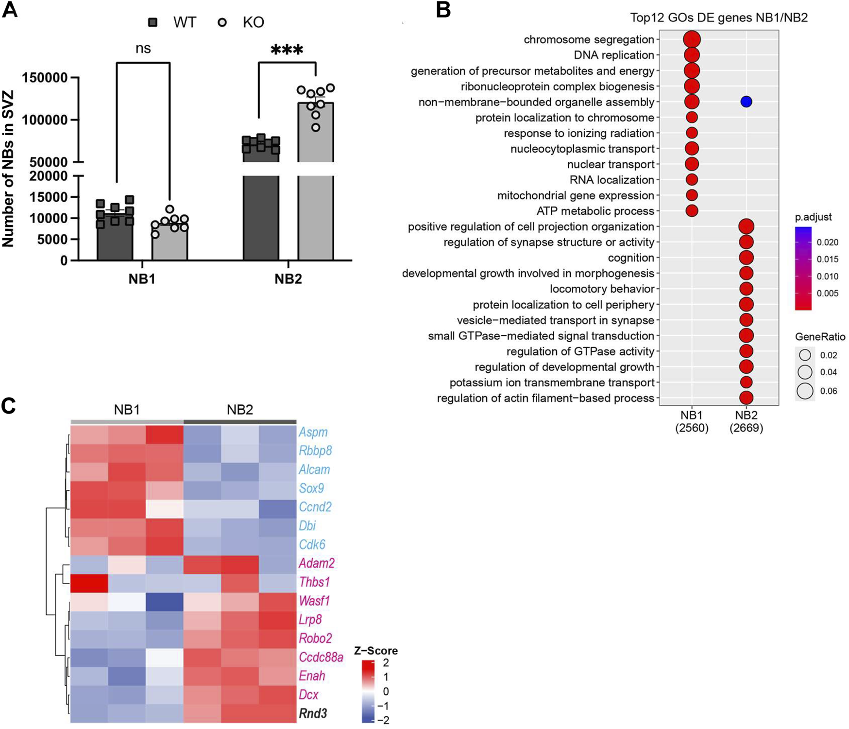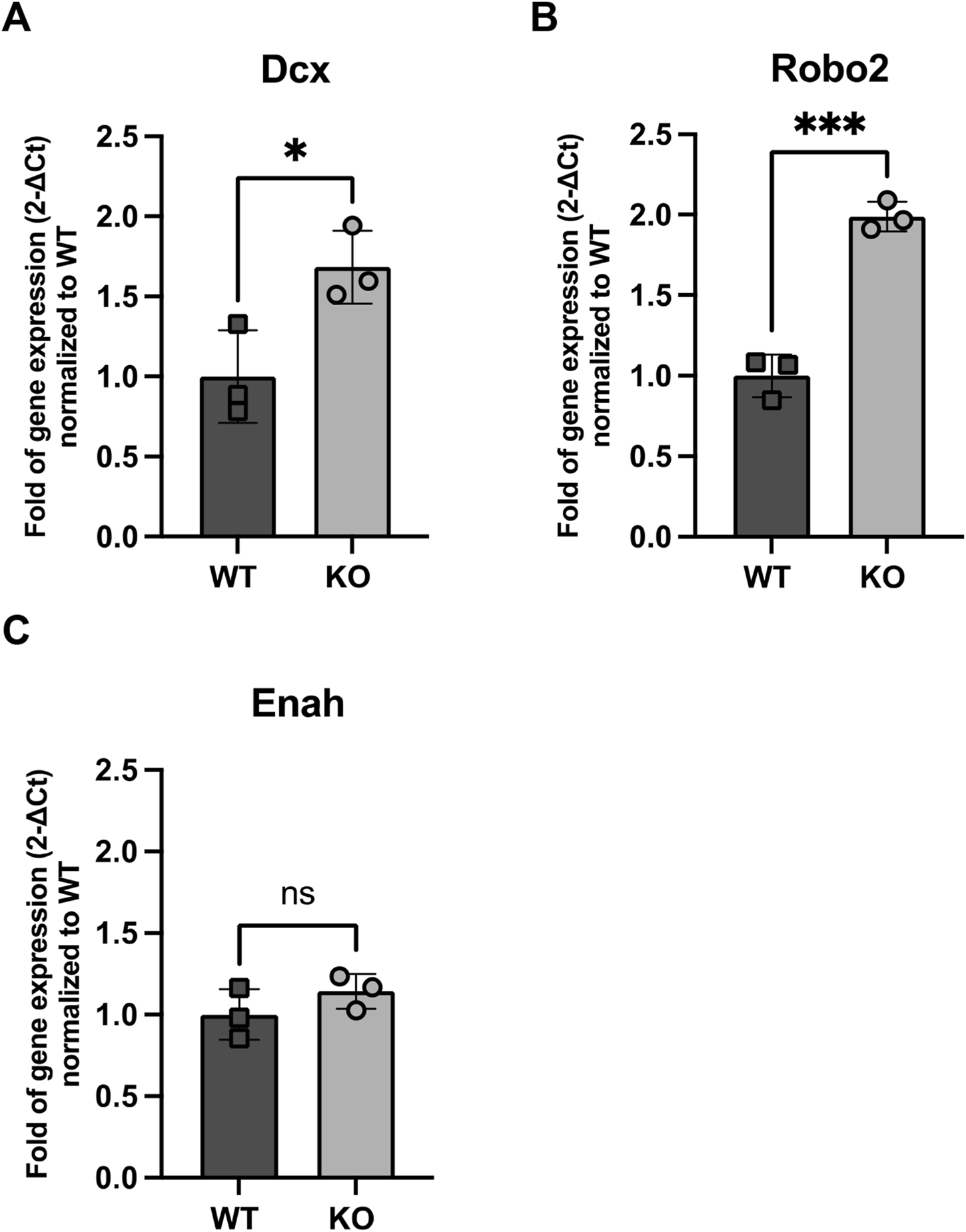 Figure 5. Expression of genes related to NB migration (A) Dcx, (B) Robo2 and (C) Enah in WT and Rnd3 KO NBs (N = 3 per group). Data are presented as mean ± SEM. ns: not statistically significant. *p ≤ 0.05, ***p ≤ 0.001 vs. WT condition.