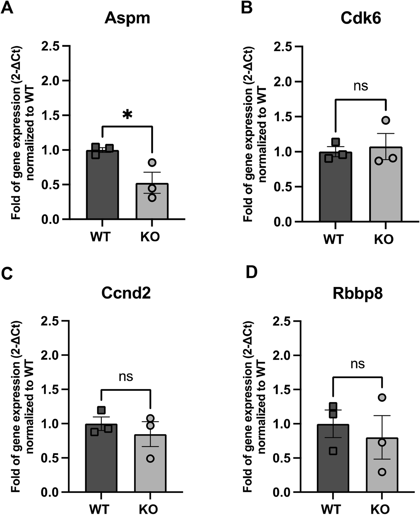Figure 6. Expression of genes related to NB proliferation (A) Aspm, (B) Cdk6, (C) Ccnd2 and (D) Rbpp8 in WT and Rnd3 KO NBs. Data are presented as mean ± SEM. ns: not statistically significant. *p ≤ 0.05 vs. WT condition.