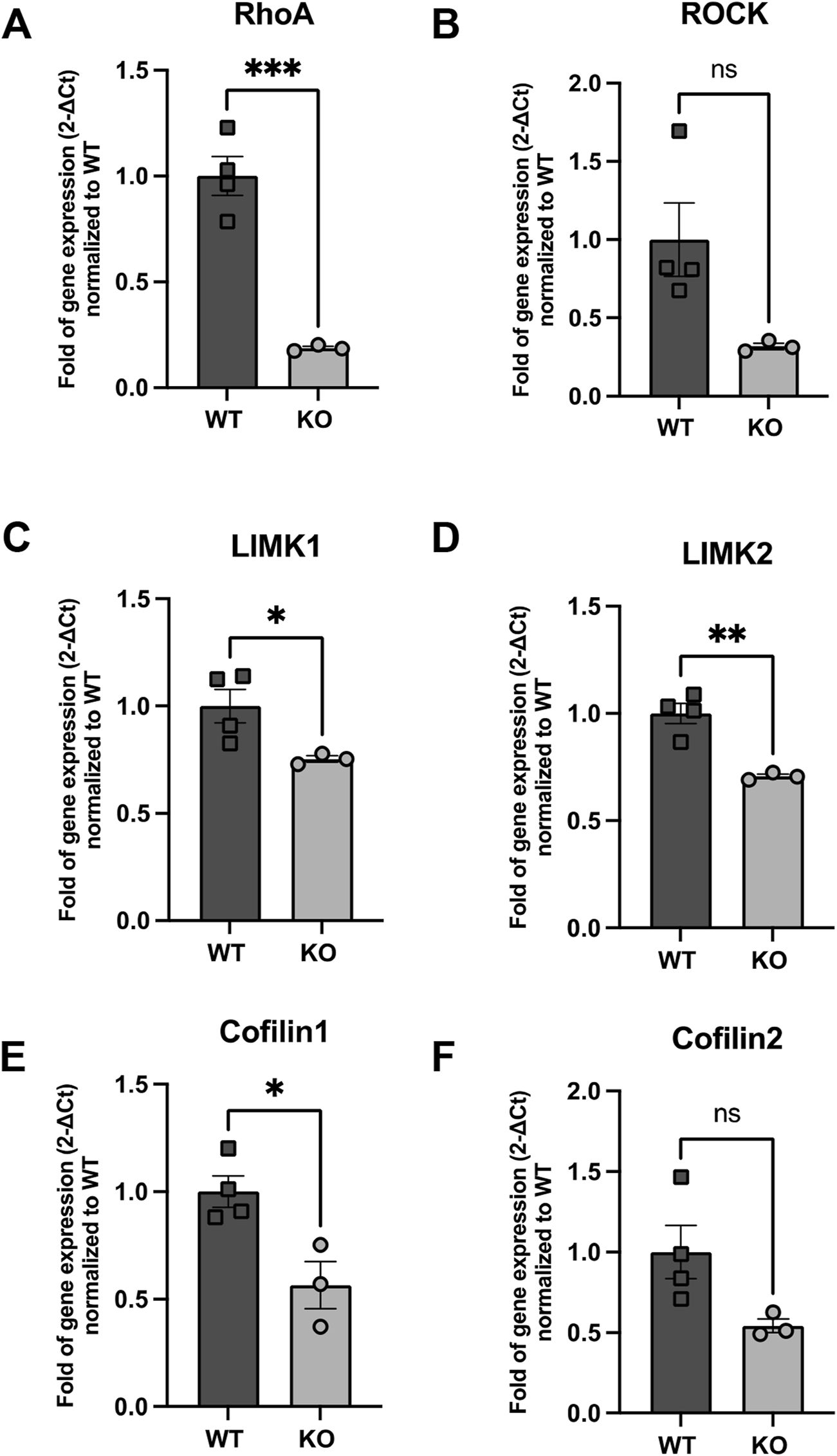 Figure 7. Expression of genes implicated in RhoA signaling (A) RhoA, (B) ROCK, (C) LIMK1 (D) LIMK2, (E) Cfl1 and (F) Cfl2 in WT and Rnd3 KO NBs. Data are presented as mean ± SEM. ns: not statistically significant. *p ≤ 0.05, **p ≤ 0.01, ***p ≤ 0.001 vs. WT condition.