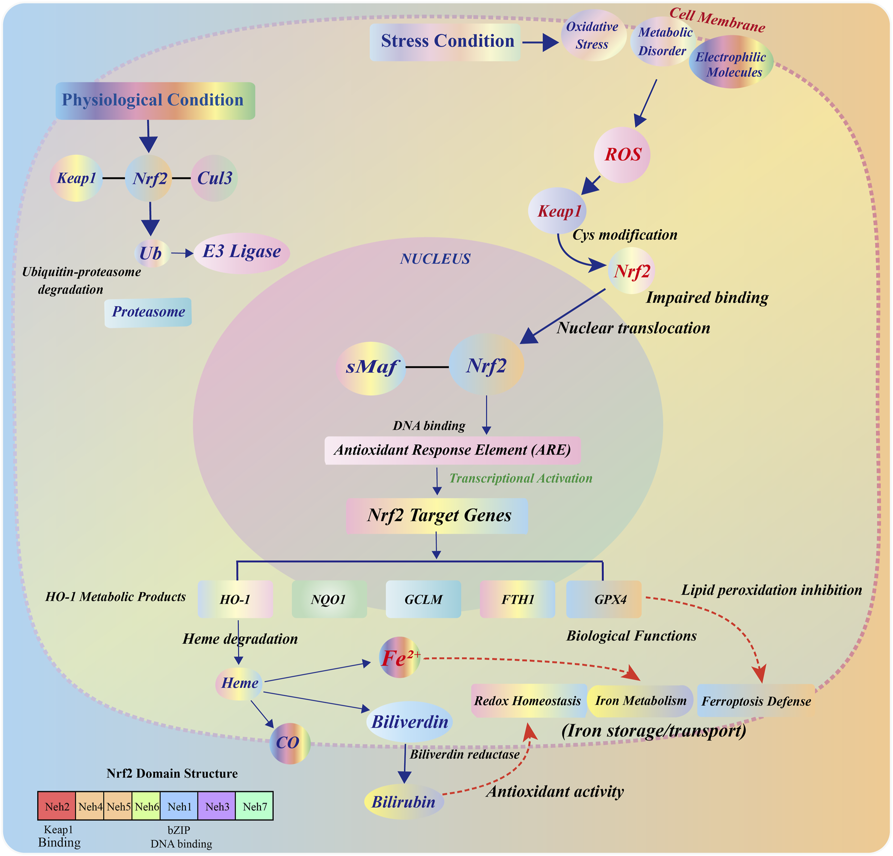 Therefore, the Nrf2/HO-1 pathway serves as an integrated protective mechanism in response to various cellular stressors, regulating redox homeostasis, iron balance, and lipid peroxidation networks in a synergistic manner. However, its biological function exhibits significant tissue-specific and pathology-dependent variations. Some studies indicate that, under certain stimuli, this pathway may shift from a protective to a disease-promoting role, highlighting the complexity of its regulatory mechanisms.