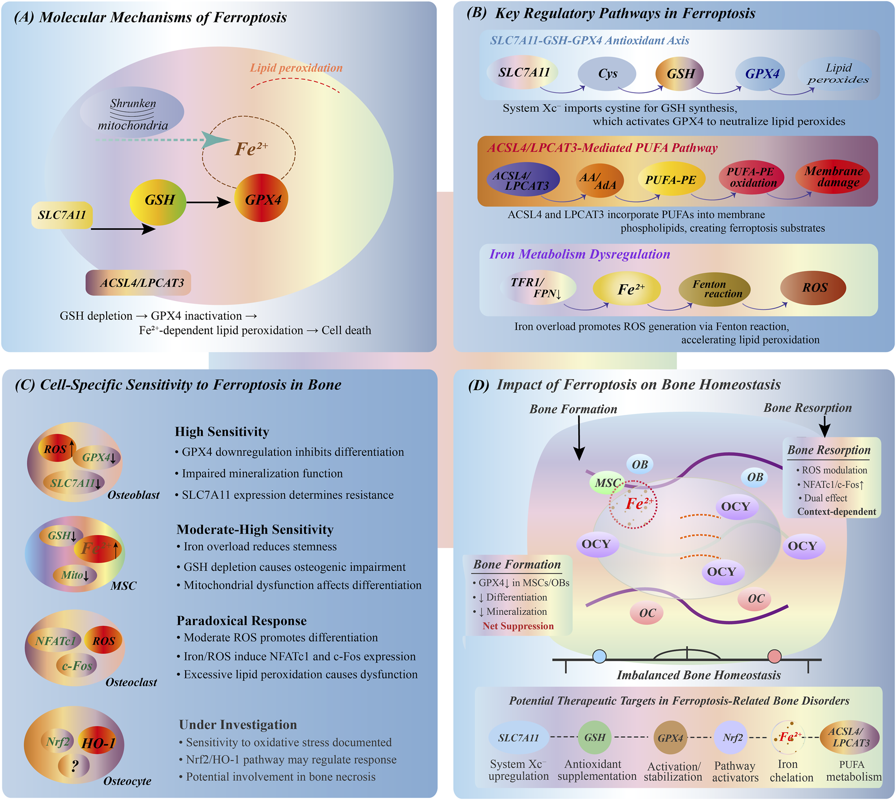This section comprehensively examines ferroptosis from two perspectives: first, we elucidate the molecular mechanisms underlying this unique form of regulated cell death; second, we explore how ferroptosis differentially affects various bone cell types and its implications for bone homeostasis.