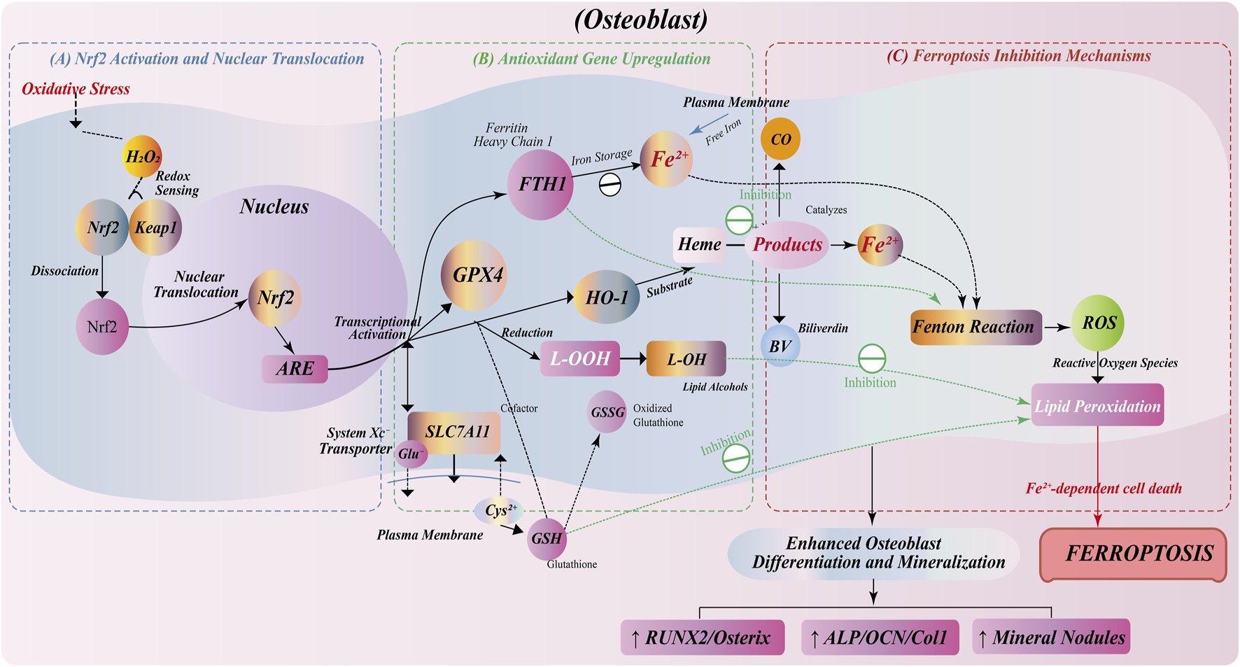 Anti-ferroptosis regulation by Nrf2/HO-1 pathway in osteoblasts. (A) Oxidative stress induces Nrf2 dissociation from Keap1, nuclear translocation, and ARE binding for antioxidant gene transcription. (B) Nrf2 activation upregulates antioxidant genes: GPX4 for lipid peroxide reduction; FTH1 for iron storage; SLC7A11 for GSH synthesis; HO-1 for heme degradation into CO, Fe2+, and BV. (C) Ferroptosis inhibition through multiple mechanisms: FTH1-mediated iron sequestration prevents Fenton reaction; GPX4/GSH system eliminates lipid peroxides; HO-1 metabolites (BV/CO) suppress ROS. This protective pathway enhances osteoblast survival, differentiation, and mineralization, with increased expression of osteogenic markers (RUNX2, Osterix, ALP, OCN, Col1) and mineralized nodule formation.