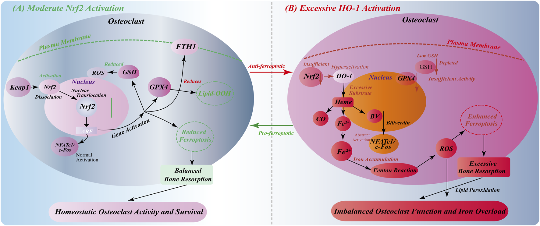 Environment-dependent bidirectional regulation of Nrf2/HO-1 signaling in osteoclasts. (A) Moderate Nrf2 activation: Oxidative stress induces Keap1-Nrf2 dissociation, nuclear translocation, and ARE-mediated gene expression. This upregulates GSH synthesis, GPX4 activity, and FTH1 expression, reducing ROS/lipid peroxidation and inhibiting ferroptosis. Normal NFATc1/c-Fos activation maintains balanced osteoclast function and bone resorption. (B) Excessive HO-1 activation: Insufficient Nrf2 function with abnormally high HO-1 expression causes excessive heme degradation and Fe2+ accumulation. GSH depletion and inadequate GPX4 activity, combined with Fenton reaction-generated ROS, promote ferroptosis. Iron overload triggers aberrant NFATc1/c-Fos signaling, leading to osteoclast hyperfunction and excessive bone resorption, disrupting bone homeostasis.