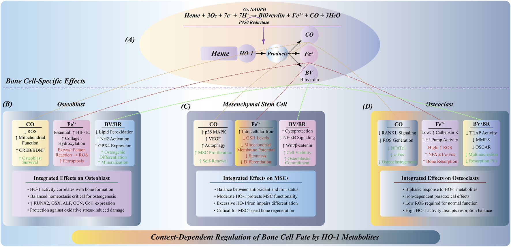 In summary, the regulation of HO-1 metabolites on the fate of osteocytes is highly environmentally dependent, and produces distinct biological effects under different cell types and different concentrations, which constitutes the molecular basis for the fine regulation of bone homeostasis. This environment-specific and cell-specific mode of action provides a new theoretical framework for understanding the pathological mechanism of bone metabolic diseases and developing targeted treatment strategies.