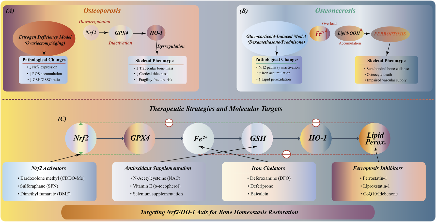 Therefore, Nrf2 dysfunction caused by estrogen deficiency or glucocorticoid treatment leads to increased oxidative stress, iron metabolism disorders and lipid peroxidation, and ultimately damages bone structure. Based on these findings, multi-target treatment strategies from Nrf2 activators to ferroptosis inhibitors have shown clinical application prospects. However, there are still many challenges in this field. The regulatory mechanism of Nrf2/HO-1 pathway in different bone cells has not been fully elucidated. The targeted delivery and long-term safety of therapeutic drugs need to be verified, and the interaction with other bone metabolic networks needs further study.