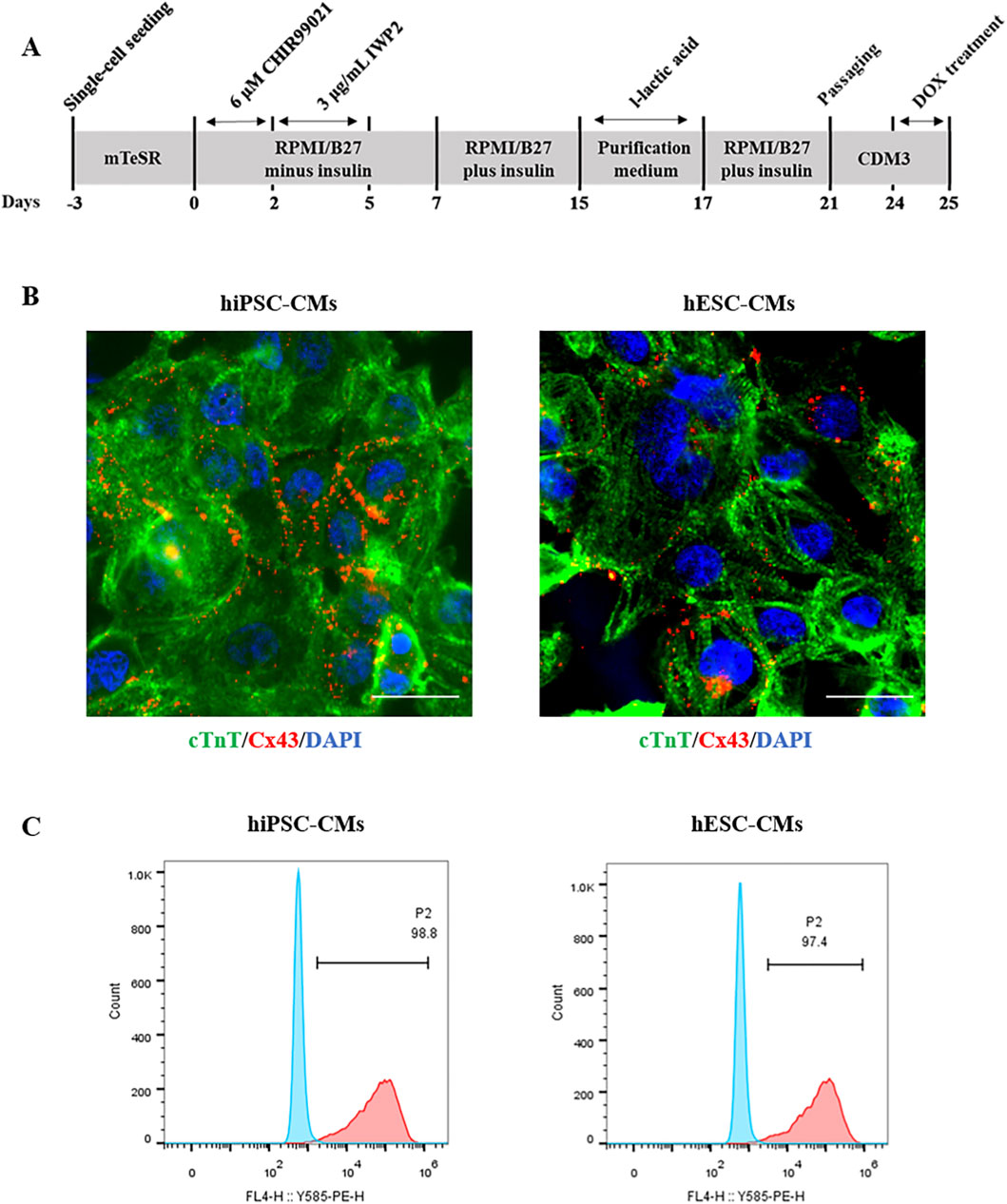 Diagram with three panels. Panel A: A timeline showing stages of cell treatment over 25 days, including compound treatments and cell media changes. Panel B: Fluorescent microscopy images of hiPSC-CMs and hESC-CMs, with green, red, and blue markers representing cTnT, Cx43, and DAPI staining, respectively. Panel C: Flow cytometry histograms for hiPSC-CMs and hESC-CMs displaying cell counts with a marked P2 population, showing percentages of 98.8 and 97.4, respectively.