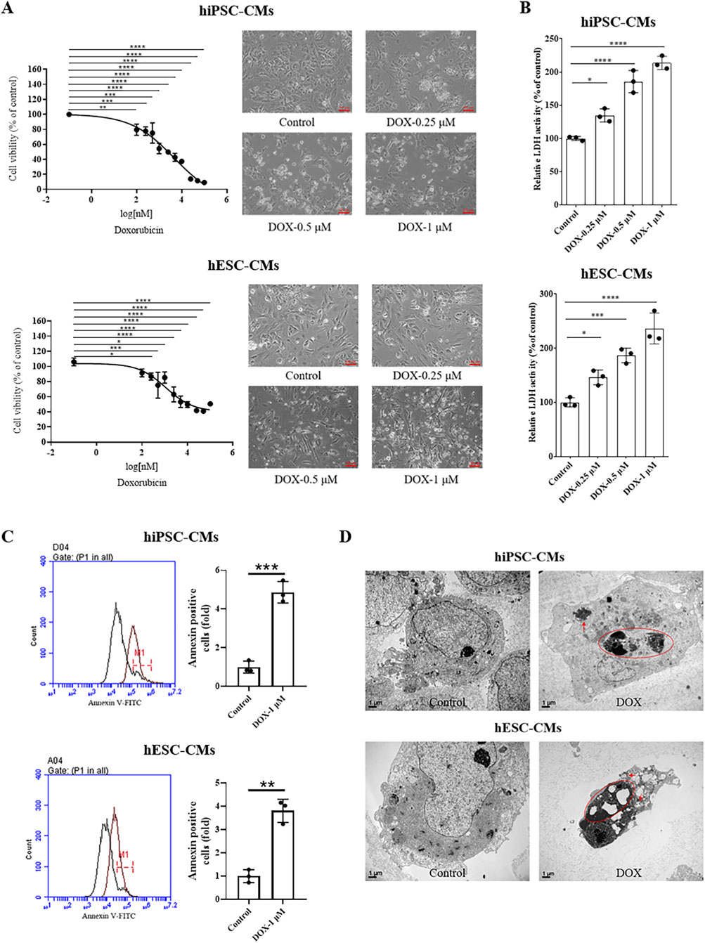 Figure 2. DOX decreased the cell viability and induced cell apoptosis of hiPSC-CMs and hESC-CMs. (A) hiPSC-CMs or hESC-CMs were treated with the different dose (0, 0.1, 0.25, 0.5, 1, 1.5, 2.5, 5.0, 10, 25, 50, 100 μM) DOX for 24 h. Cell viability was assessed by CCK-8 assay. Scale bar, 100 μm. P values were calculated using one-way ANOVA followed by Dunnett’s post hoc test comparing each DOX-treated group vs. the vehicle control group. *P < 0.05, **P < 0.01, ***P < 0.001, ****P < 0.0001. (B) The LDH activity of hiPSC-CMs and hESC-CMs after treatment with DOX (0, 0.25, 0.5, 1 μM) for 24 h. P values were calculated using one-way ANOVA followed by Dunnett’s post hoc test comparing each DOX-treated group vs. the vehicle control group. *P < 0.05, ***P < 0.001, ****P < 0.0001. (C) Following treatment with 1 μM DOX for 24 h, cells were collected and analyzed by flow cytometry using Annexin V-FITC staining. P values were calculated using an unpaired two-tailed t-test comparing the DOX-treated group vs. the vehicle control group. **P < 0.01, ***P < 0.001. (D) Morphologies of nuclear shrinkage and apoptotic bodies were observed by TEM in 1 μM DOX treatment group. The red circle represents nuclear shrinkage and the red arrow indicates autophagosome. Scale bar, 1 μm. (n = 3, mean = S.D).