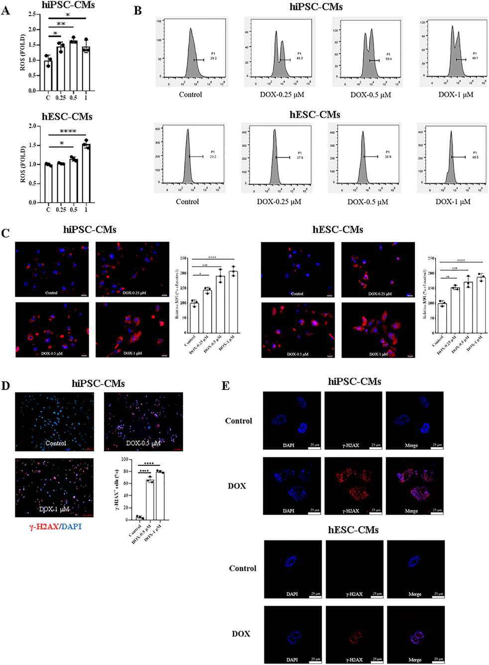 Panel A shows bar graphs of ROS levels in hiPSC-CMs and hESC-CMs with varying DOX concentrations. Panel B presents histograms depicting cell counts under different conditions. Panel C includes fluorescence images of hiPSC-CMs and hESC-CMs with DOX treatment and corresponding bar graphs of relative fluorescence. Panel D displays fluorescence images of hiPSC-CMs stained for γ-H2AX and DAPI, with a bar graph for γ-H2AX positive cells. Panel E provides high-magnification images of hiPSC-CMs and hESC-CMs with DAPI and γ-H2AX staining, showing control and DOX-treated conditions.