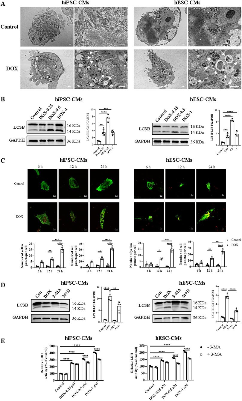 Figure 4. Treatment with DOX upregulated hiPSC-CMs and hESC-CMs autophagy. (A) Representative TEM images of hiPSC-CMs and hESC-CMs treated overnight with 0.5 μM DOX. Arrowhead, autophagosomes and autolysosomes. Scale bars, 1 μm. (B) Western blot analysis of LC3B in hiPSC-CMs and hESC-CMs following DOX (0, 0.25, 0.5, 1 μM) treatment. P values were calculated using one-way ANOVA followed by Dunnett’s post hoc test comparing each DOX-treated group vs. the vehicle control group. ***P < 0.001, ****P < 0.0001. (C) Representative fluorescence images o and quantitative data f hiPSC-CMs and hESC-CMs expressing mCherry-GFP-LC3 and treated with 0.5 μM DOX for 6, 12 and 24 h, respectively. Autophagosomes, yellow puncta; autolysosome, red puncta. Scale bars, 10 μm. Data were analyzed by two-way ANOVA; *P < 0.05, **P < 0.01, ***P < 0.001, ****P < 0.0001. (D,E) hiPSC-CMs and hESC-CMs were incubated with 5 mM 3-MA for 12 h prior to stimulation with 0.5 μM DOX or different concentrations of DOX (0, 0.25, 0.5, 1 μM), then both were maintained for 24 h. (D) The effect of 3-MA on the expression ratio of LC3 II/LC3 I in hiPSC-CMs and hESC-CMs analyzed by Western blotting. P values were calculated using one-way ANOVA followed by Dunnett’s post hoc test for multiple comparisons among all groups (Control, DOX, 3-MA, M + D). **P < 0.01, ****P < 0.0001. (E) By spectrophotometry, LDH activity in the culture media was measured. P values were calculated using two-way ANOVA. ****P < 0.0001. The lower band is LC3 II and the higher one is LC3 I on LC3B membrane. GAPDH was used as a loading control and grayscale analysis was performed for statistics. (n = 3-4, mean = S.D.).