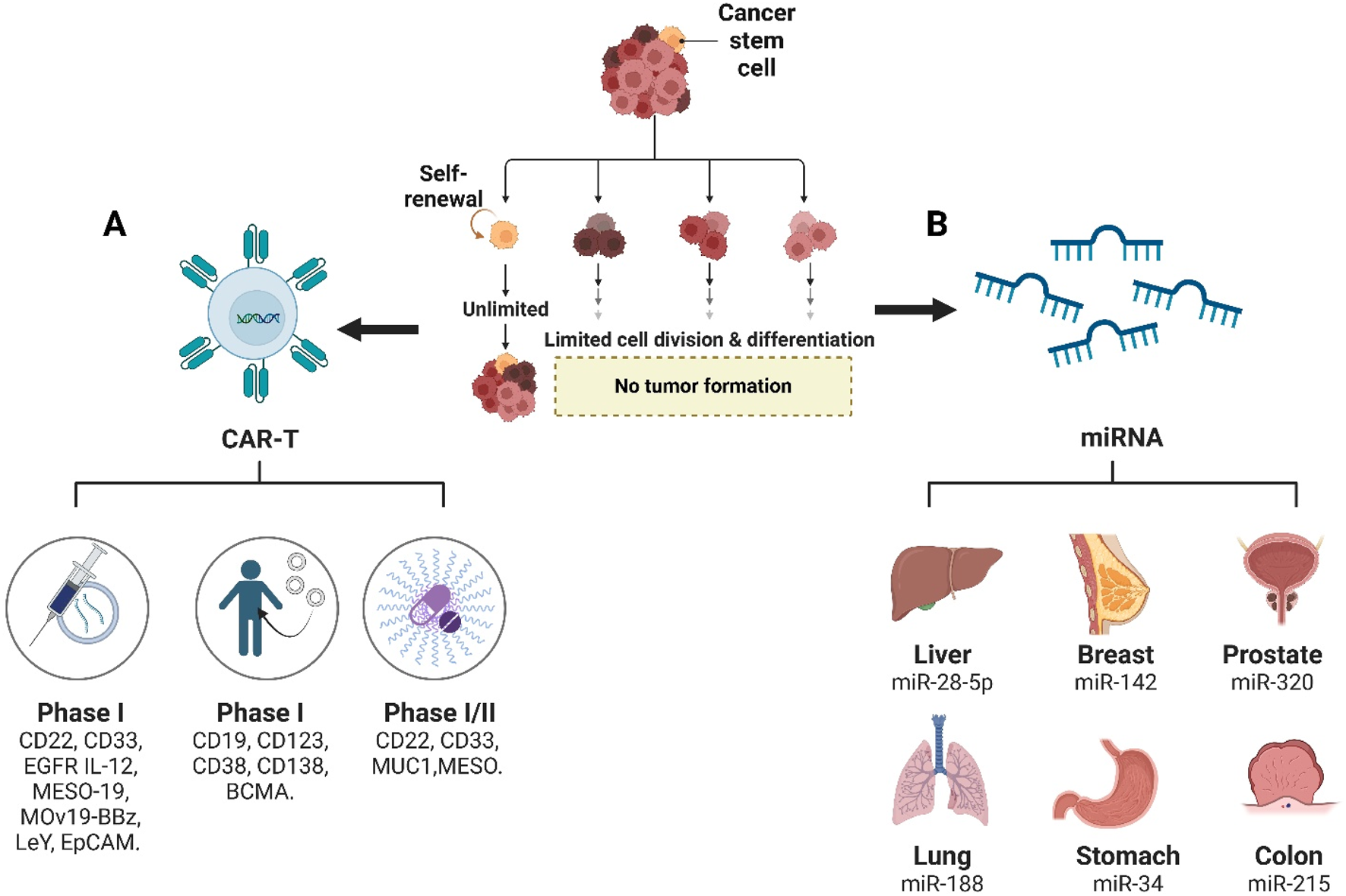 Therapeutic strategies targeting cancer stem cells (CSCs). (A) CAR-T cell therapies against CSC surface markers are currently in clinical development, with Phase I trials targeting CD19, CD22, CD33, CD38, CD123, CD138, BCMA, EGFR, IL-12, MESO, and EpCAM, and Phase I/II trials evaluating CD22, MUC1, and MESO. (B) Organ-specific miRNA therapeutics for CSC suppression include miR-28-5p in liver cancer, miR-142 in breast cancer, miR-320 in prostate cancer, miR-188 in lung cancer, miR-34a in gastric cancer, and miR-215 in colon cancer.