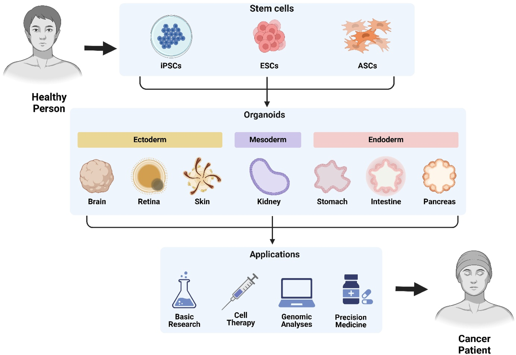 Stem cell-derived organoids: Generation and translational applications. Patient-derived organoids are generated from induced pluripotent stem cells (iPSCs), embryonic stem cells (ESCs), or adult stem cells (ASCs). These differentiate through germ layers (ectoderm, mesoderm, endoderm) into functional organoids including brain, retina, skin, kidney, gastric, intestinal, and pancreatic models. Applications span basic research, cell therapy, genomic analyses, precision medicine, and cancer modeling.