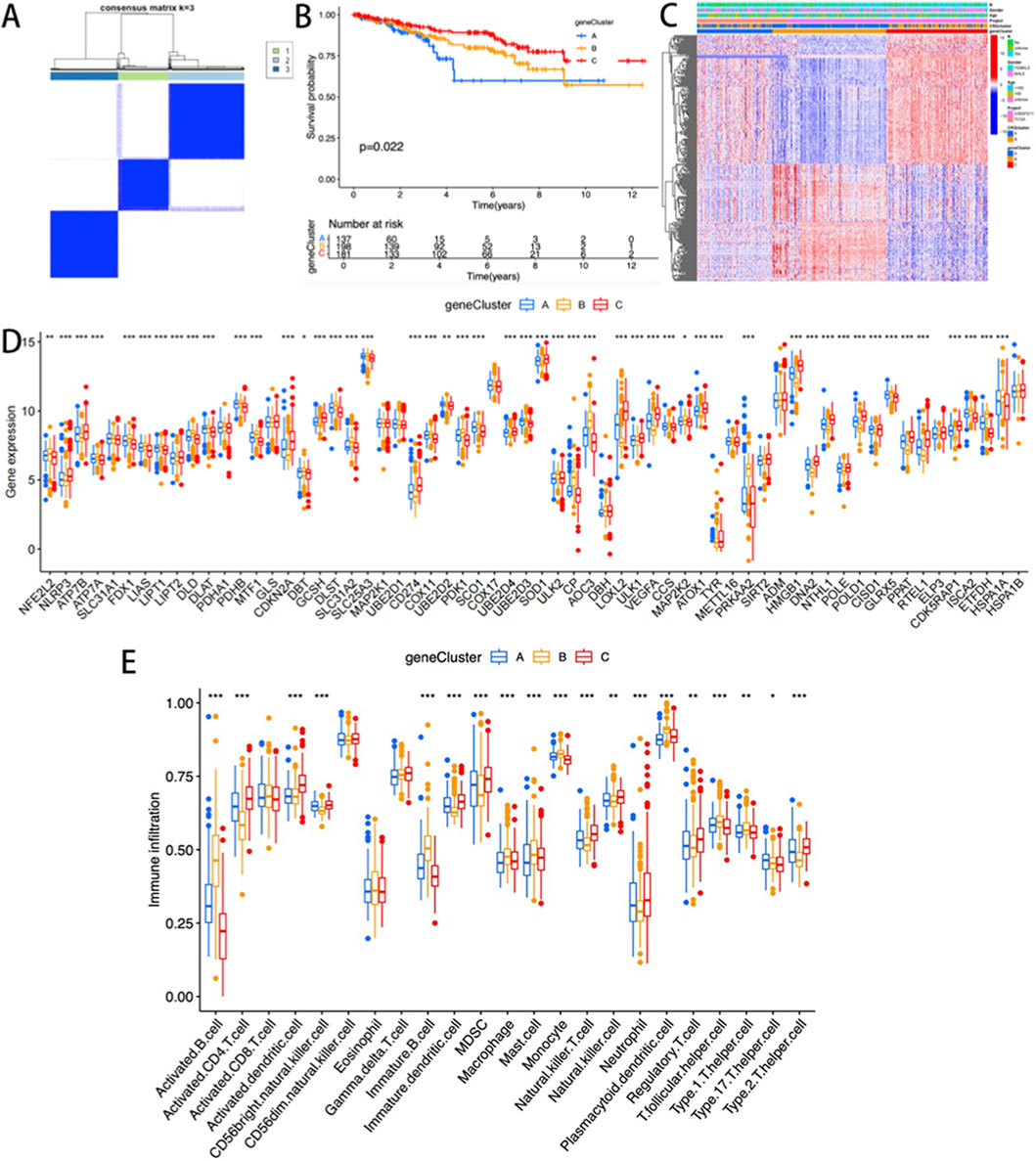 Figure 3. (A) Consensus clustering matrix (k = 3); (B) K-M curves of the three gene subtypes; (C) The heatmap visualization illustrates the differences in clinical pathological parameters among three gene clusters; The differences in the expression level; (D) and immune cell infiltration level; (E) of CRGs among the three gene clusters.