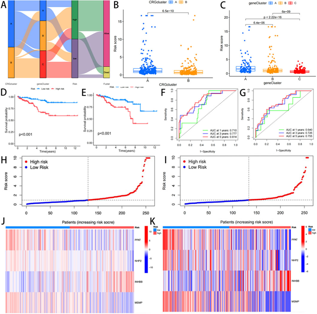 Figure 4. (A) Sankey Diagram; (B,C) Differences in cuproptosis risk scores; (D,E) Differential analysis of gene clusters related to cuproptosis K-m survival analysis between the training group and the experimental group; (F,G) ROC curves for predicting 1 -, 3 -, and 5-year survival; (H,I) risk distribution maps; (J,K) genotyping heat maps of the high-risk and low-risk patient groups.