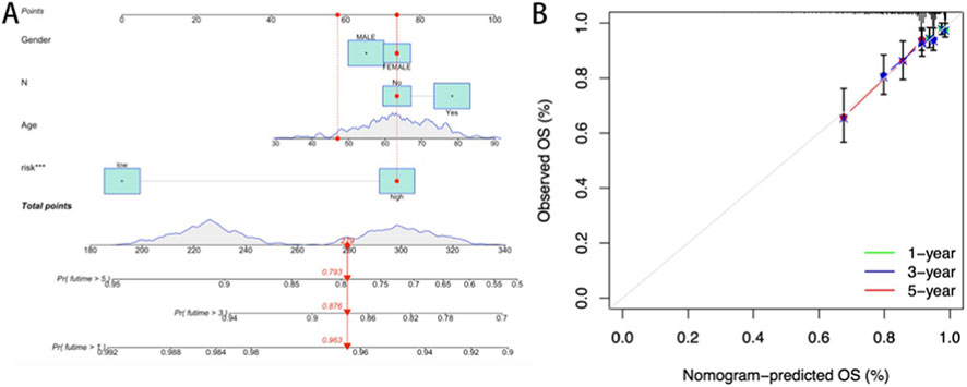 Figure 5. (A) Nomogram constructed based on the risk score and clinicopathological characteristics; (B) Calibration curve of the prognostic model.