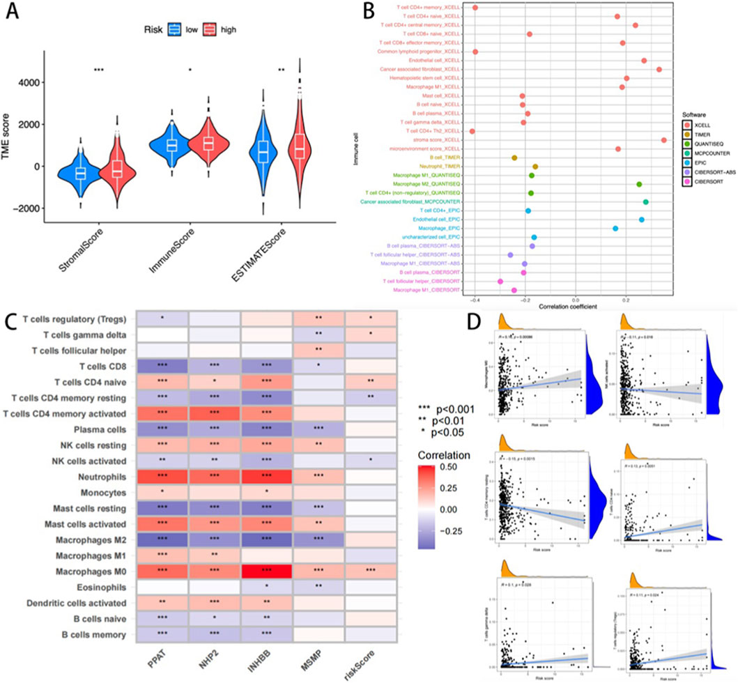 Figure 6. (A) The differences between the high-risk and low-risk groups across the three immune algorithms; (B) Heat maps describing the changes in the content of immune cells in different algorithms; (C) Heat map of the correlation between immune cells and four key genes. (D) Correlation between cuproptosis risk score and six key immune cells (M0 Macrophages, activated NK cells, CD4 memory resting T-cells, CD4 naïve T-cells, gamma delta T-cells, and regulatory T-cells (Tregs).