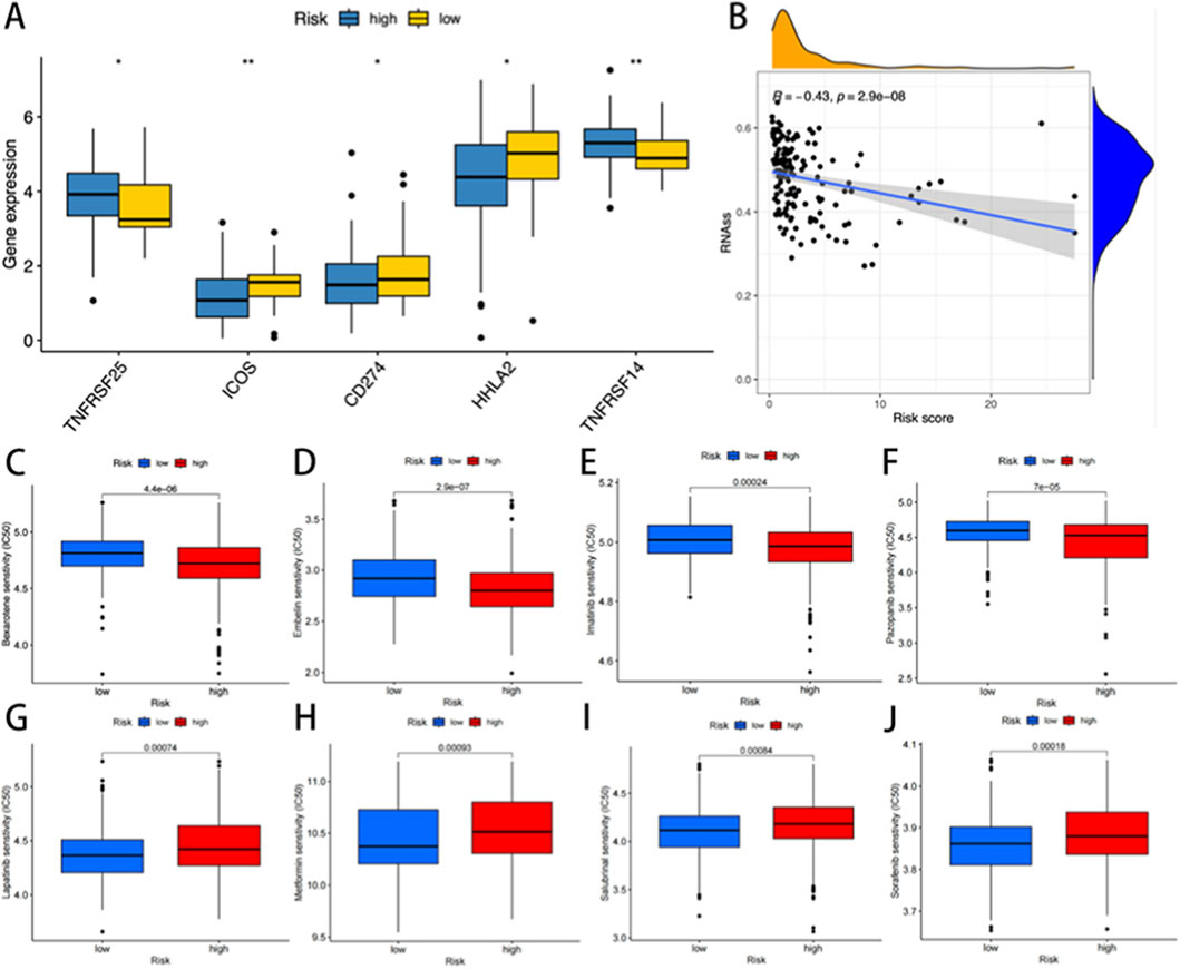 Figure 7. (A) The expression of immune checkpoint genes in the high and low-risk groups. (B) Correlation analysis between cuproptosisrisk score and stem cells. The IC50 was significantly reduced for drugs such as high-risk bexarotene, embelin, imatinib, and pazopanib (C–F). In contrast, the low-risk group showed significantly lower IC50 levels for lapatinib, metformin, salubrinal, and sorafenib (G–J).
