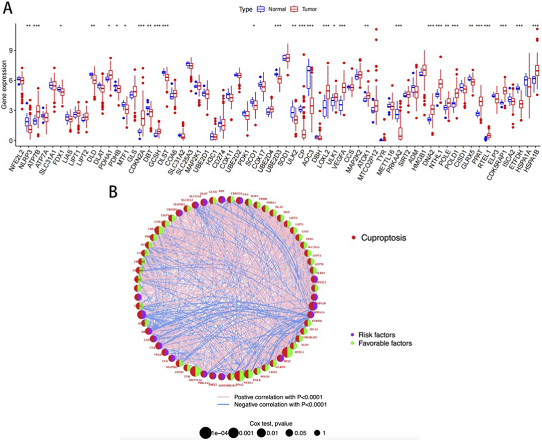 (A) Differential expression of CRGs; (B) Correlation network diagram of CRGs.